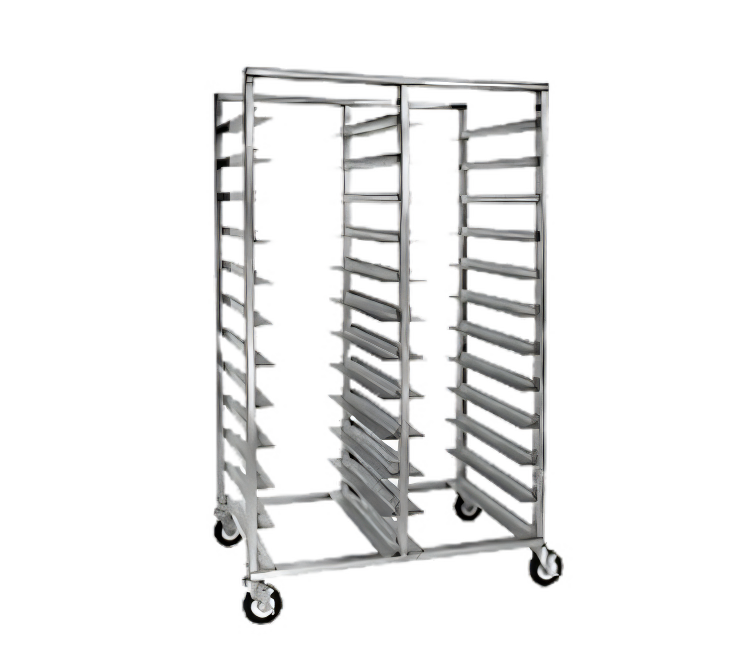 Rack, Mobile Tray, Double Compartment, open frame design, extruded frame construction, with slides for 13" x 18", 14" x 18", 18" x 26" trays, slides on 5-1/8" centers, welded extruded aluminum frame, (2) swivel & (2) swivel/brake 5" casters, NSF