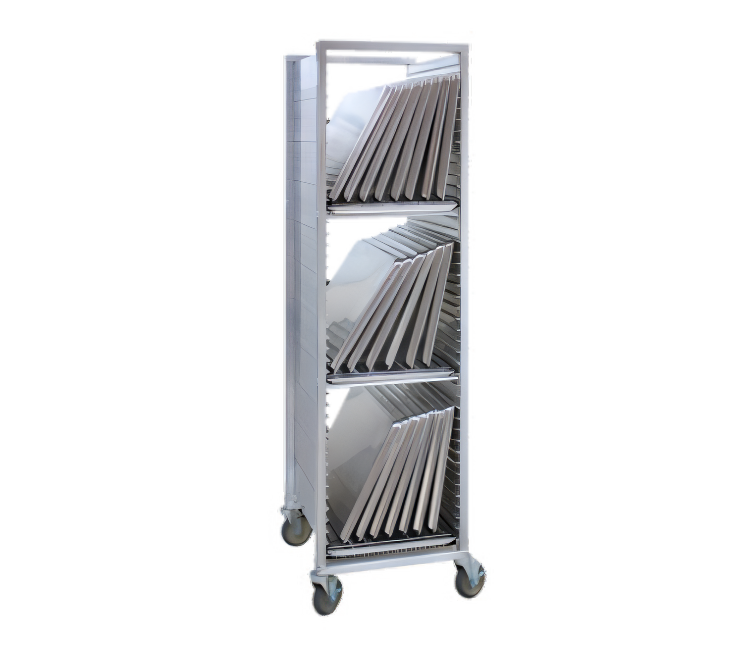 Sheet Pan Drying Rack, mobile, 3 sections, (36) 18" x 26" tray capacity, 1-1/2" centers, aluminum construction, (4) heavy duty 5" swivel casters (2) braked NSF