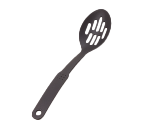 Crestware 12" nylon slotted spoon in black — durable, heat-resistant, gentle on cookware for efficient draining and serving.