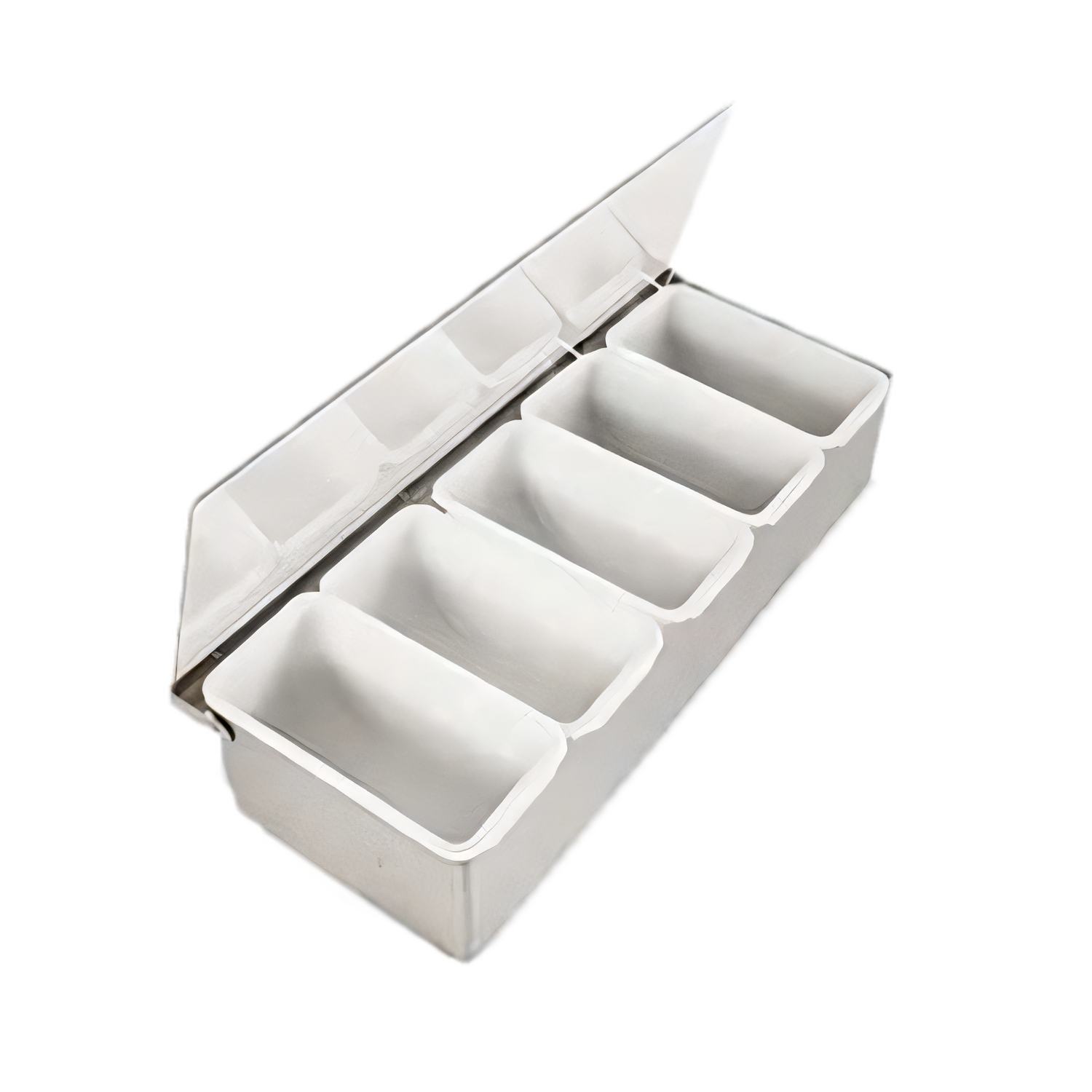 Condiment Dispenser, 5 compartment with inserts, 15" x 6" x 3-1/2", stainless steel frame and hinge, high impact Plexiglas, clear