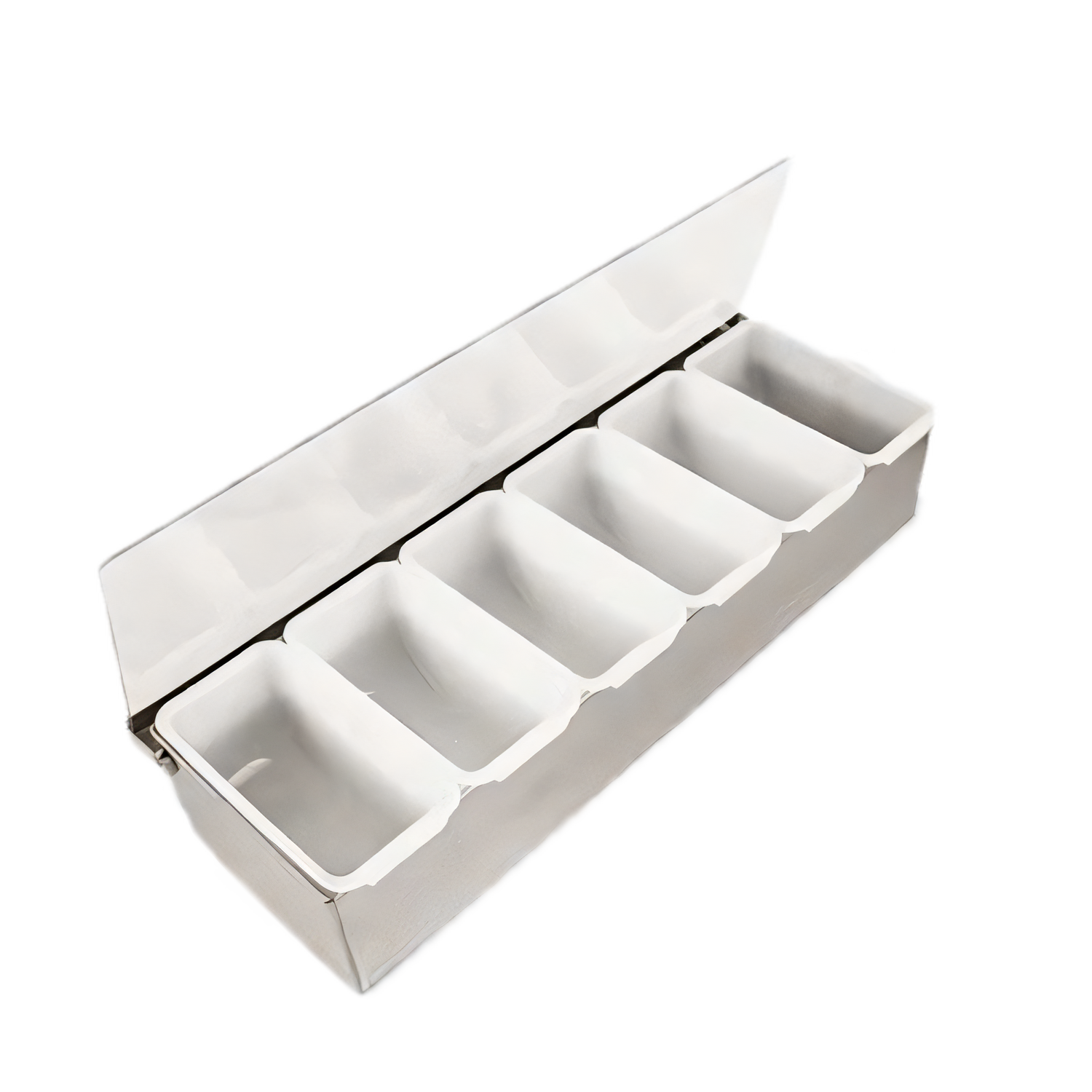 Condiment Dispenser, 6 compartment with inserts, 17-3/4" x 6" x 3-1/2", stainless steel frame and hinge, high impact Plexiglas, clear