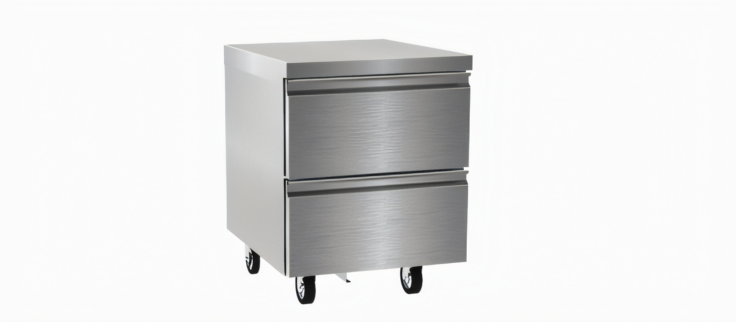 - (2) full-extension drawers with lifetime-warranted slide system; each drawer accepts 1 full-size 12" × 20" pan + 3 sixth-size pans (pans not included).