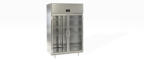 Delfield DSLH2-G heated 2-section reach-in cabinet: 46.5 cu ft, glass doors, adjustable shelves, stainless steel, digital control.