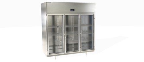 Delfield DSLR3-G 3-section reach-in refrigerator, 68.3 cu ft, glass doors, LED lighting, digital control, stainless steel, R290 efficient.
