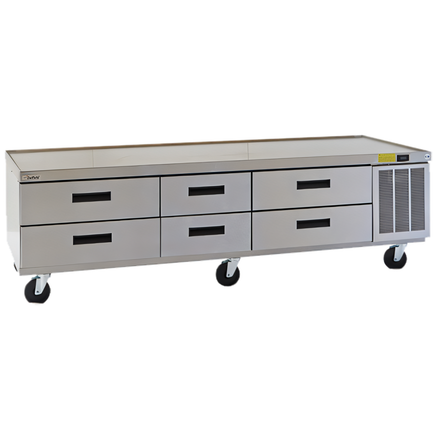 87-1/4" W | 6 Drawer | Self-Contained Side-Mount RefrigerationPut cold storage exactly where you cook. The F2987CP combines Delfield’s heavy-duty equipment support with a high-performance 36-40°F refrigerated base, so proteins, garnishes and back-up product stay safe and within arm’s reach of the line.