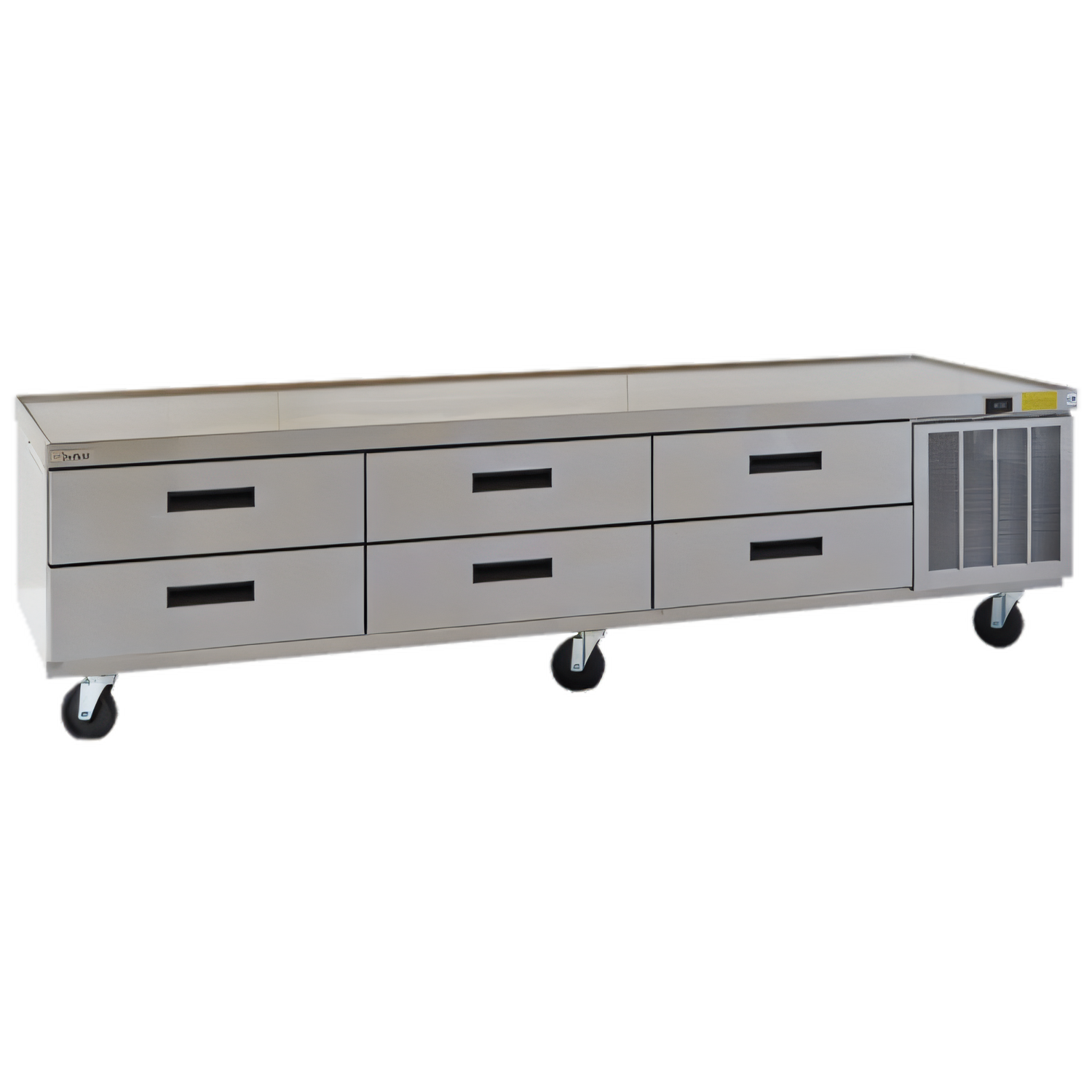- Three refrigerated sections with six Full Extension Plus drawers—each holds (2) standard 12 × 20 × 4 in. hotel pans (pans sold separately).