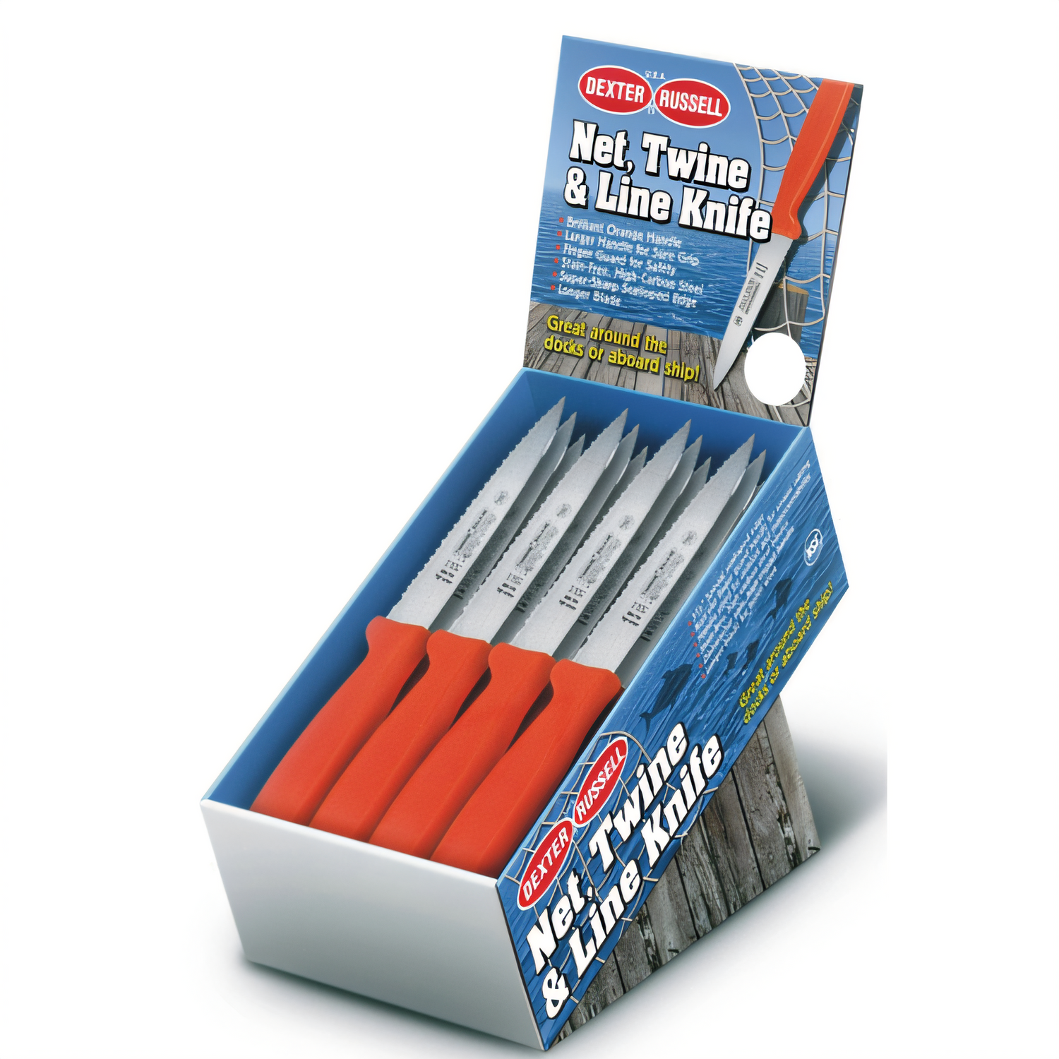 Dexter Russell Sani-Safe 3.5" scalloped net/twine knife, NSF certified, high-carbon blade, finger guard, non-slip orange handle — box of 36
