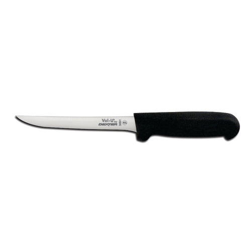 Dexter Russell 6" Val-U boning knife: narrow stamped DEXSTEEL high-carbon blade, straight edge, finger guard, NSF approved, black handle.