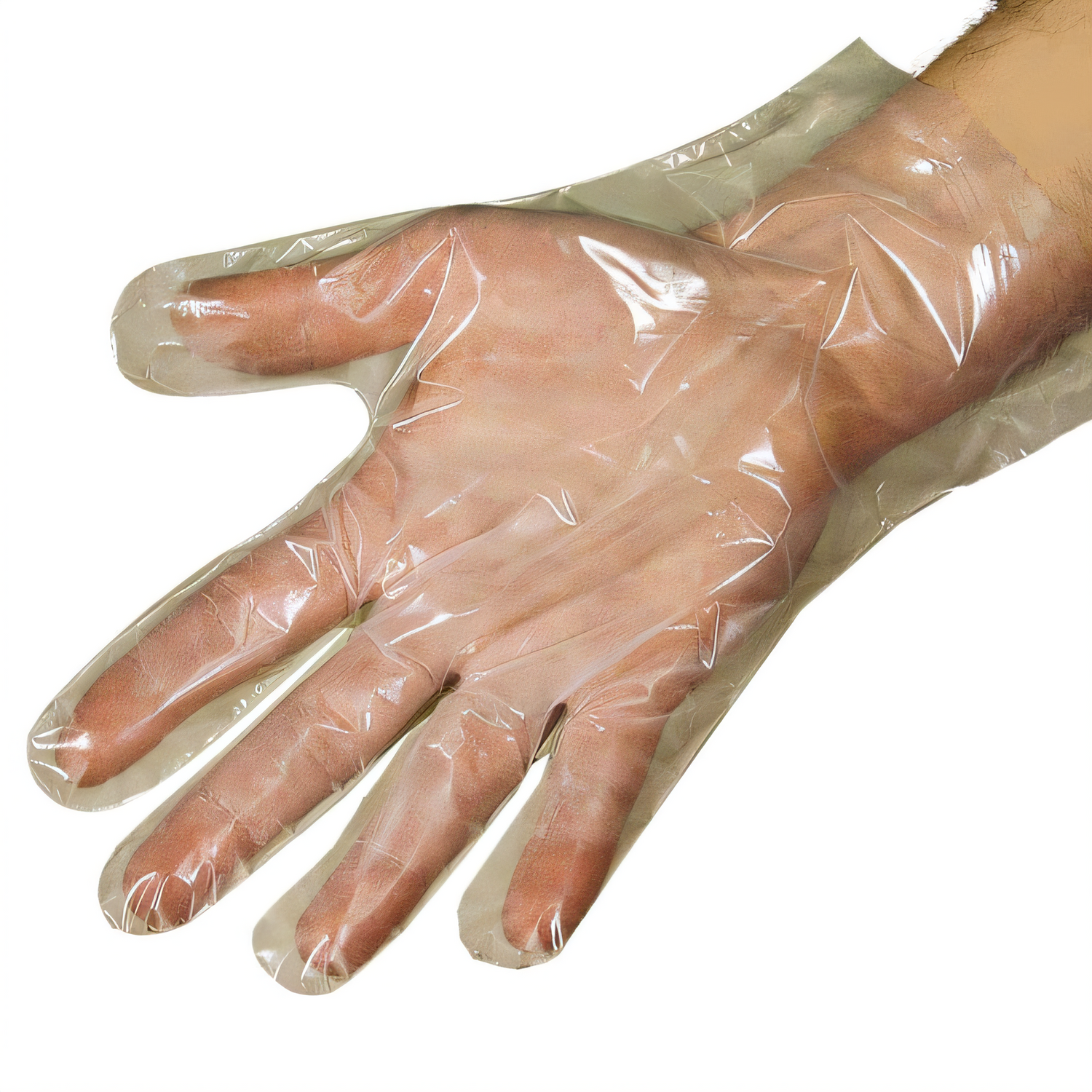 Disco IMP-S disposable polyethylene foodservice gloves, small, wrist-length, embossed for grip; clear, bulk case of 10,000 for kitchens.