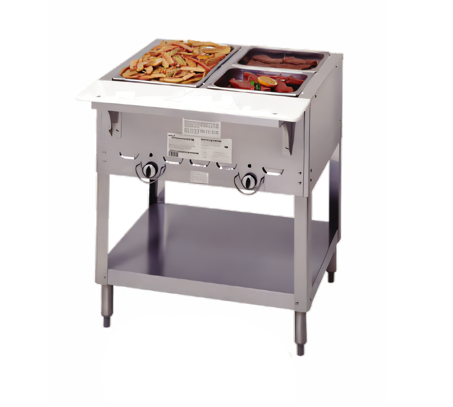 Aerohot Steamtable Hot Food Unit, gas, 44-3/8"W x 22-7/16"D x 34"H, (3) 12" x 20" hot food wells with adjustable gas valve controls with adjustable pilot light, stainless steel top with 1/2" thick x 7" wide poly carving board, stainless steel open base with undershelf, legs & feet, UL EPH Classified, CSA Star