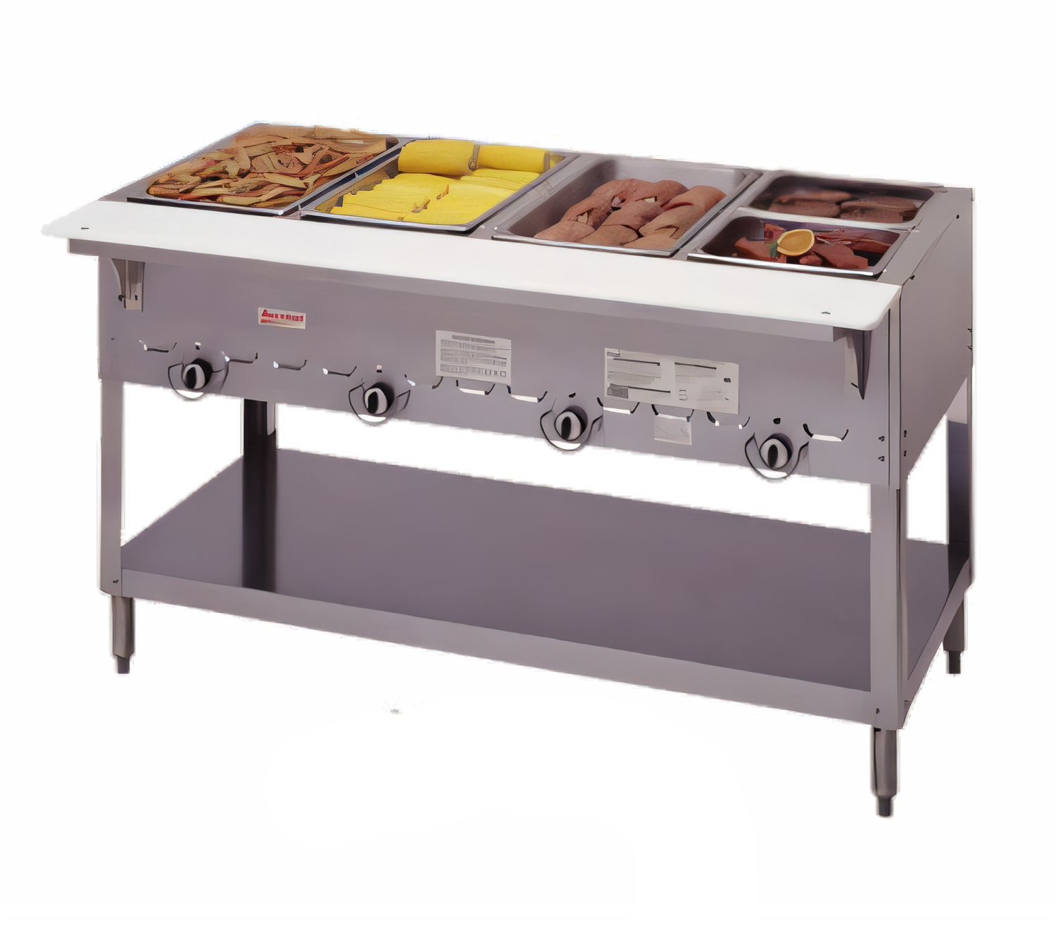 Aerohot Steamtable Hot Food Unit, gas, 58-3/8"W x 22-7/16"D x 34"H, (4) 12" x 20" hot food wells with adjustable gas valve controls with adjustable pilot light, stainless steel top with 1/2" thick x 7" wide poly carving board, stainless steel open base with undershelf, legs & feet, UL EPH Classified, CSA Star