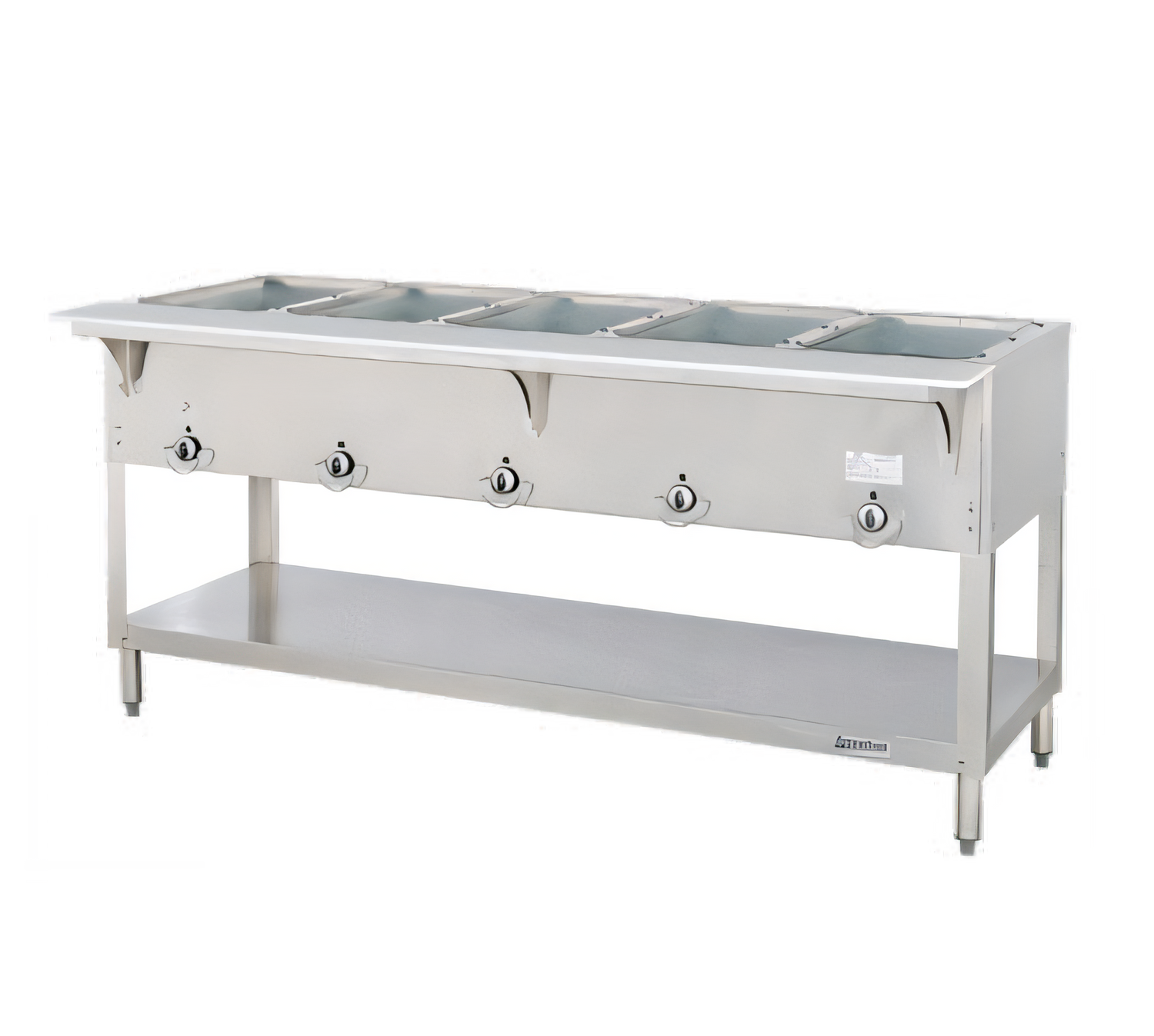 Aerohot™ Hot Food Station, electric, 72-3/8"W x 22-7/16"D x 33-3/8"H, (5) 12" x 20" sealed hot food wells with individual drains with valves, infinite controls, stainless steel top with 1/2" thick x 7" wide poly carving board, stainless steel open base with undershelf, legs & feet, 6' cord & plug, cULus, UL EPH Classified