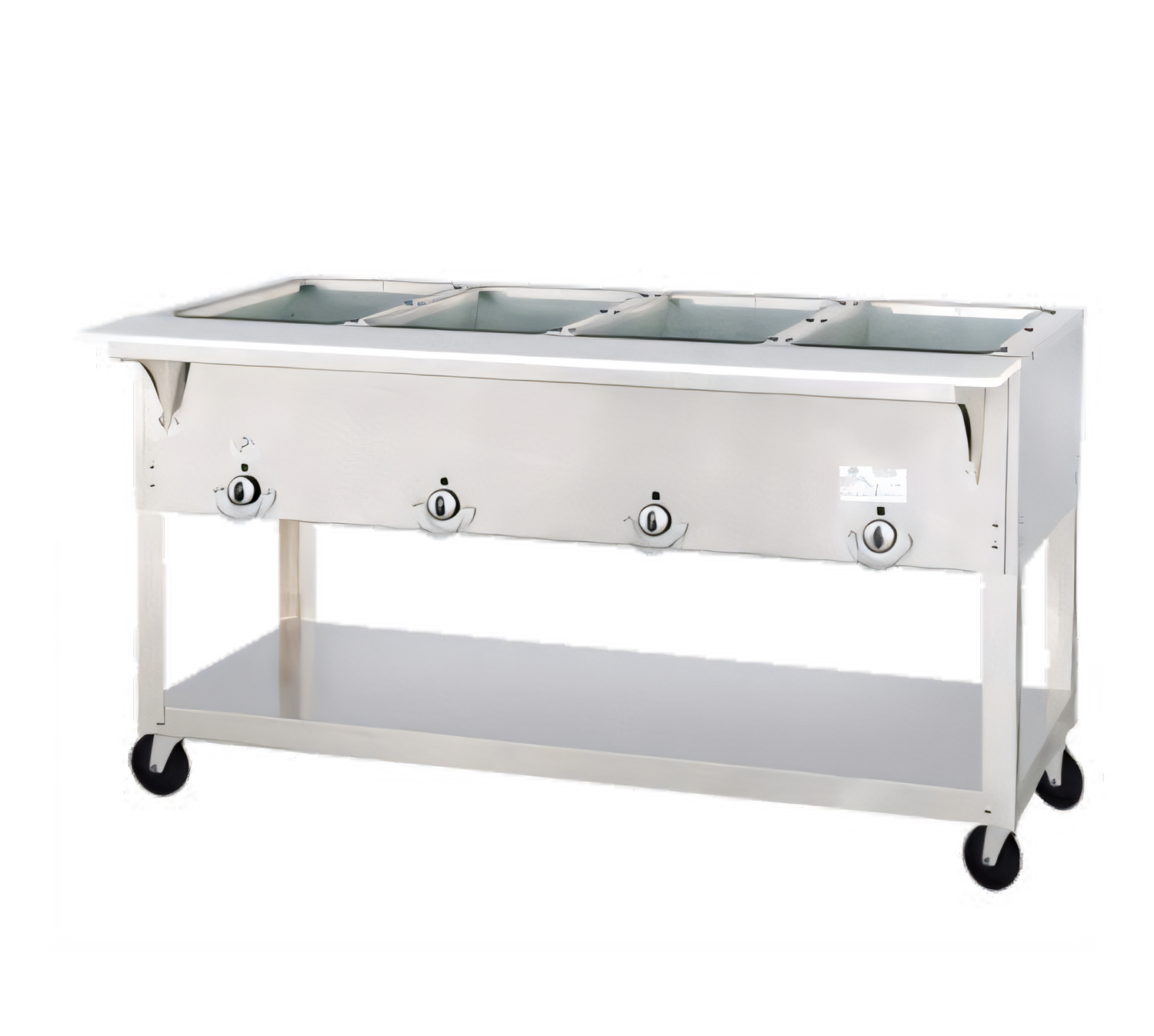 Aerohot Steamtable Portable Hot Food Unit, 58-3/8"W, electric, (4) 12" x 20" hot food wells with exposed elements, infinite controls, stainless steel top with 1/2" thick x 7" wide poly carving board, stainless steel open base with undershelf, 5" casters, 6' cord & plug, cULus, UL EPH Classified