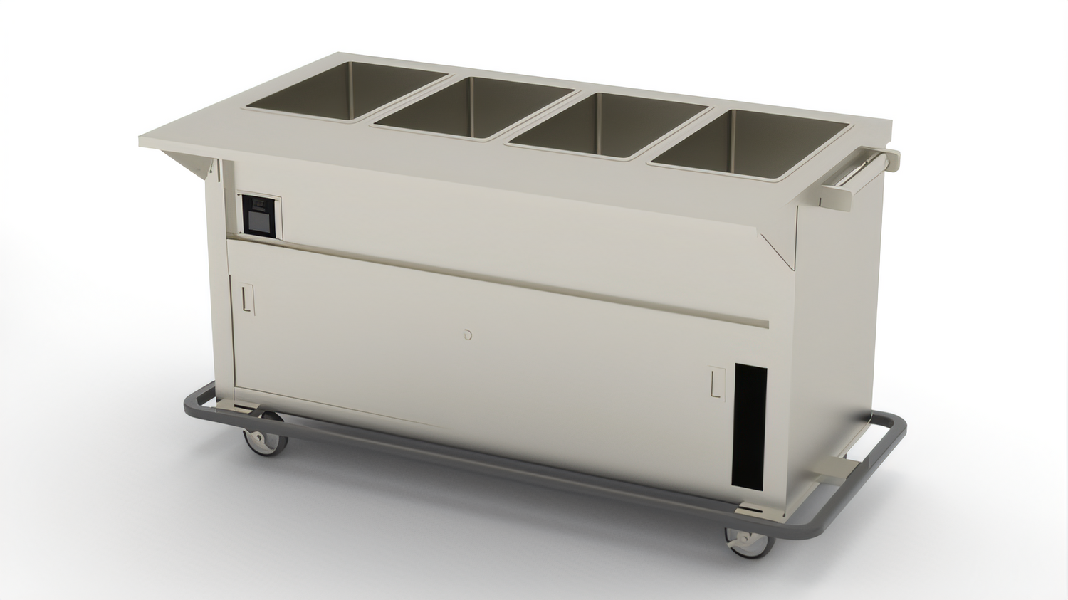 Thurmaduke™ Ganged Waterless Well Steamtable, portable, 60"W x 35-1/2"D x 36"H, 16ga stainless steel top, (4) stainless steel sealed wells, touch screen control, stainless steel cutting board on hinged brackets, 20ga stainless steel body, undershelf & doors, bumper, 5" dia. casters, 6' cord & plug, cULus, UL EPH CLASSIFIED