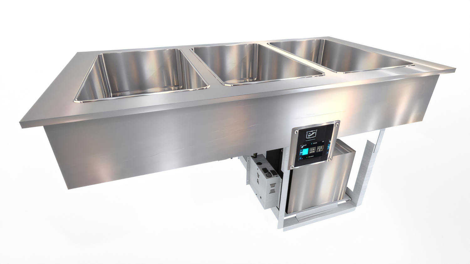 Flush Mount Cold Pan Unit, drop-in, 46-13/16"W x 26"D x 24"H, (3) pan size, touchscreen control, 12" x 20" food pan, drain for each well manifolded to one location, stainless steel top, 10 ft. cord & plug, 120v/60/1-ph, R290, NEMA 5-15P, 6.8 amps, cULus, UL EPH Classified