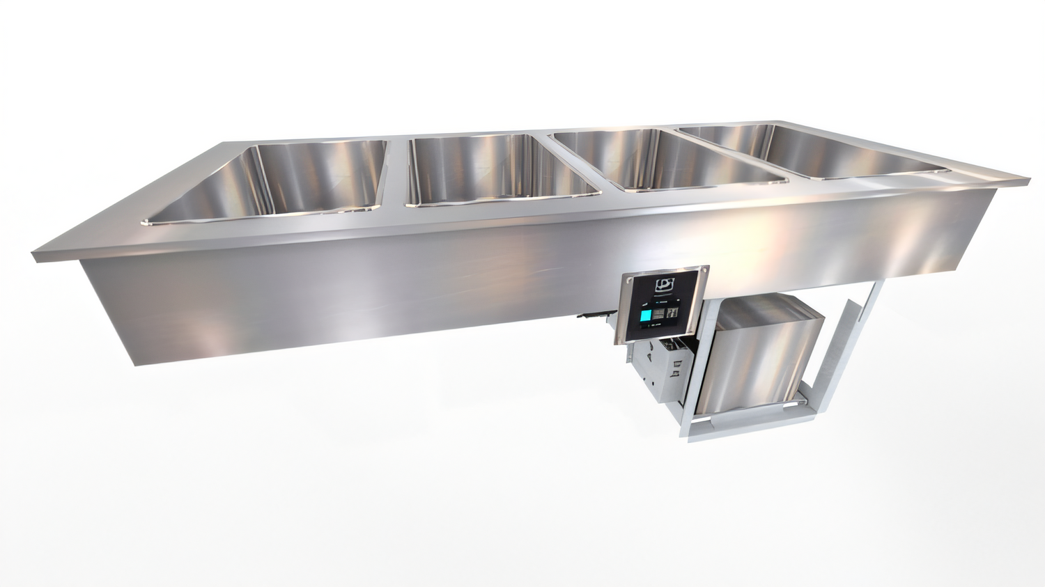 Flush Mount Cold Pan Unit, drop-in, 60-13/16"W x 26"D x 24"H, (4) pan size, touchscreen control, 12" x 20" food pan, drain for each well manifolded to one location, stainless steel top, 10 ft. cord & plug, 120v/60/1-ph, R290, NEMA 5-15P, 6.8 amps, cULus, UL EPH Classified