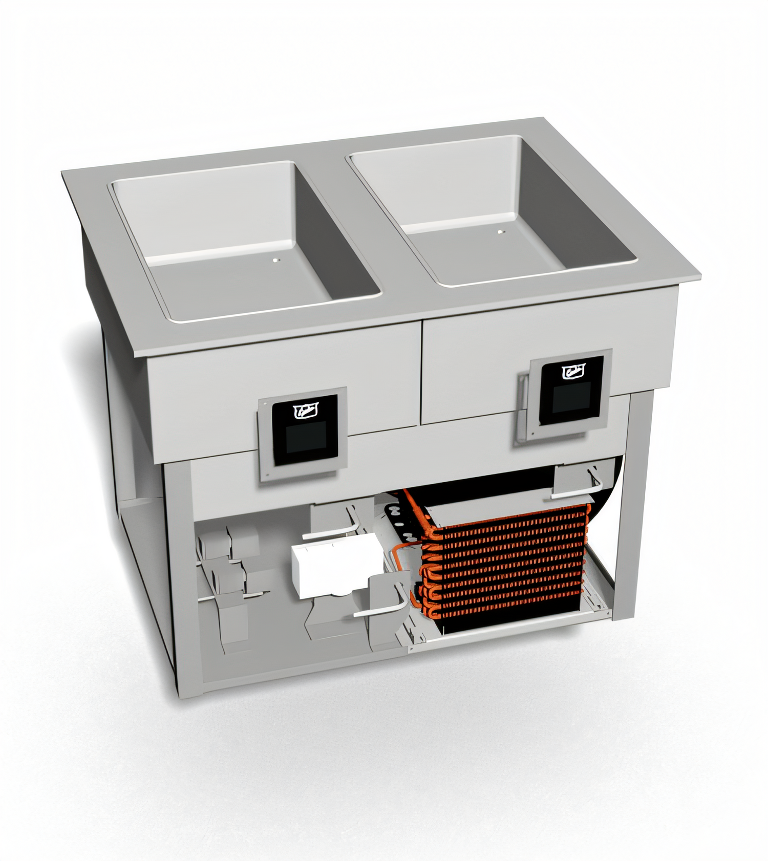 Hot/Cold/Freeze Drop-In Food Well Unit, 33-3/16"W x 25-1/2"D x 25-13/16"H, flush mount pans, (2) 12" x 20" individual pan, individual wired remote digital controls for hot or cold operation, individual drain, 10 ft. cord & plug, cULus, UL EPH Classified
