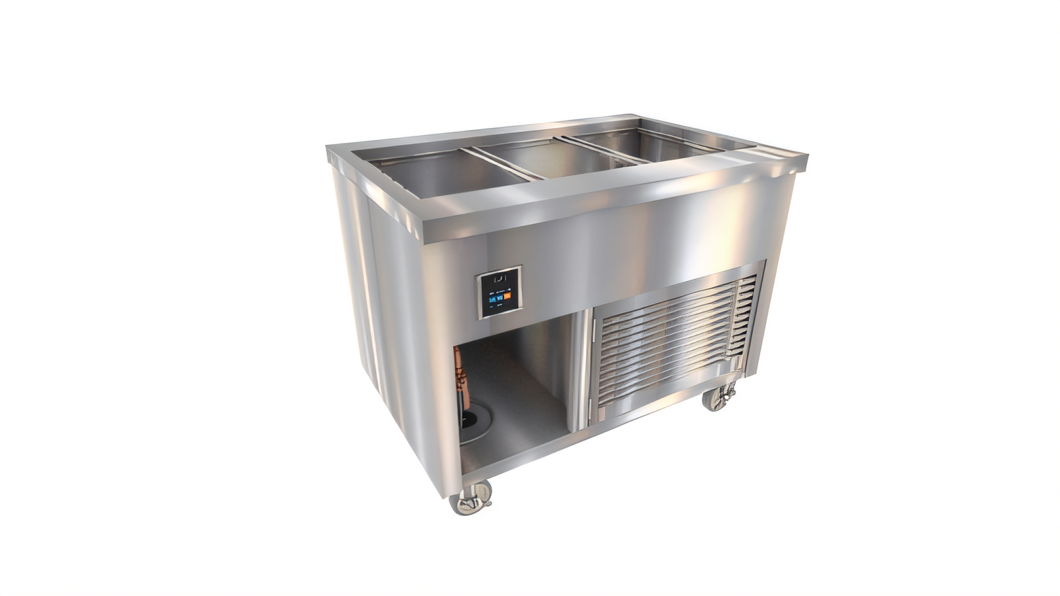 Thurmaduke™ Cold Food Unit, mobile, 46"W x 32"D x 36"H, 16ga stainless steel top, NSF 7 stainless steel mechanical cold pan, 8" deep, touchscreen control (for optional mechanical control, see configuration options), 42-1/2" x 21-3/4" liner, 1" drain line & valve, hinged stainless steel louvred grill, paint grip steel body & undershelf, 5" dia. swivel casters & brakes, R290 compliance (stainless steel louver and partition), 120v/60/1-ph, 5.2 amps, NEMA 5-15, cULus, UL EPH Classified