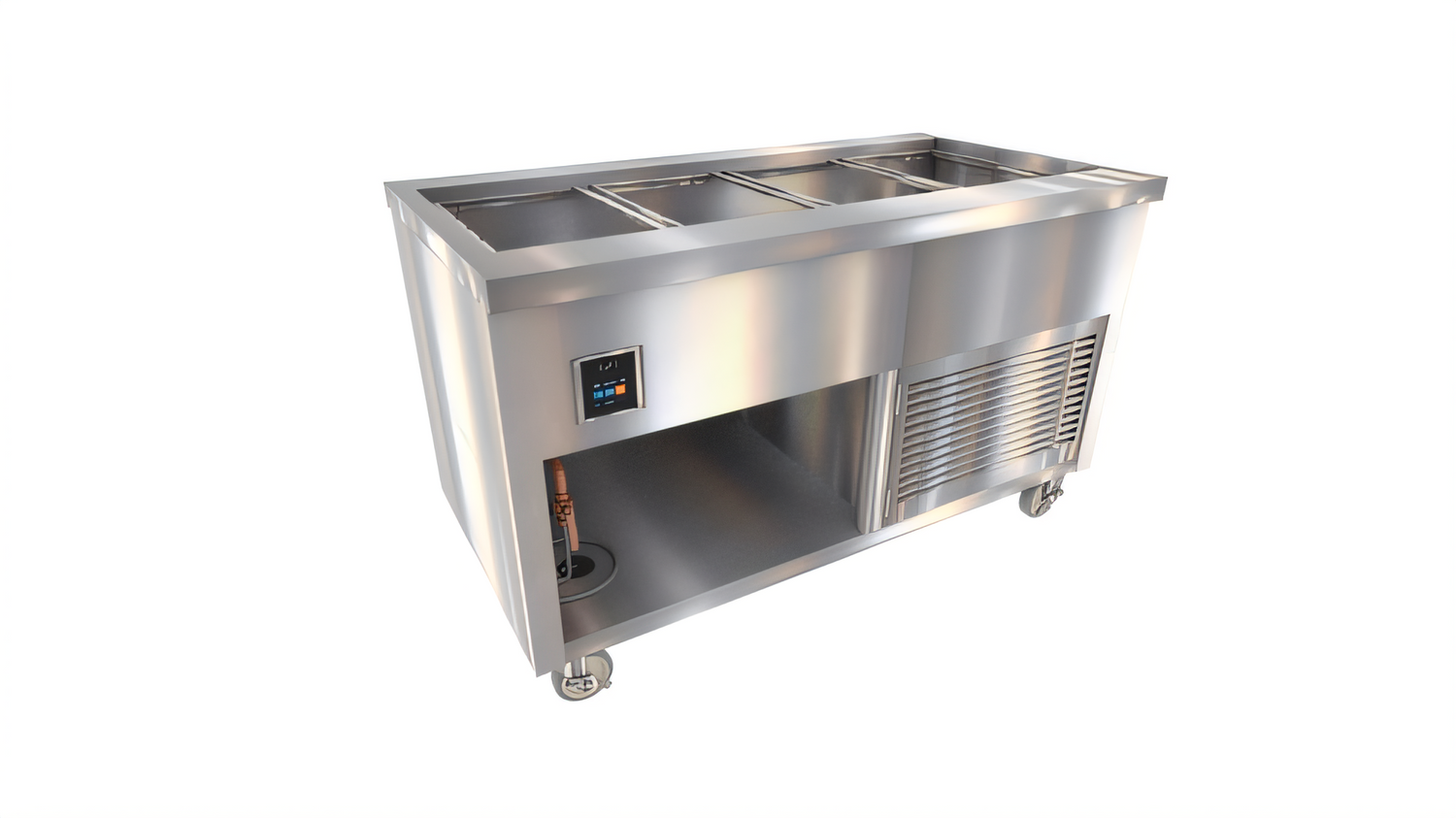 Thurmaduke™ Cold Food Unit, mobile, 74"W x 32"D x 36"H, 16ga stainless steel top, NSF 7 stainless steel mechanical cold pan, 8" deep, touchscreen control (for optional mechanical control, see configuration options), 70-1/2" x 21-3/4" liner, 1" drain line & valve, hinged stainless steel louvred grill, paint grip steel body & undershelf, 5" dia. swivel casters & brakes, R290 compliance (stainless steel louver and partition), 120v/60/1-ph, 6.9 amps, NEMA 5-15, cULus, UL EPH Classified