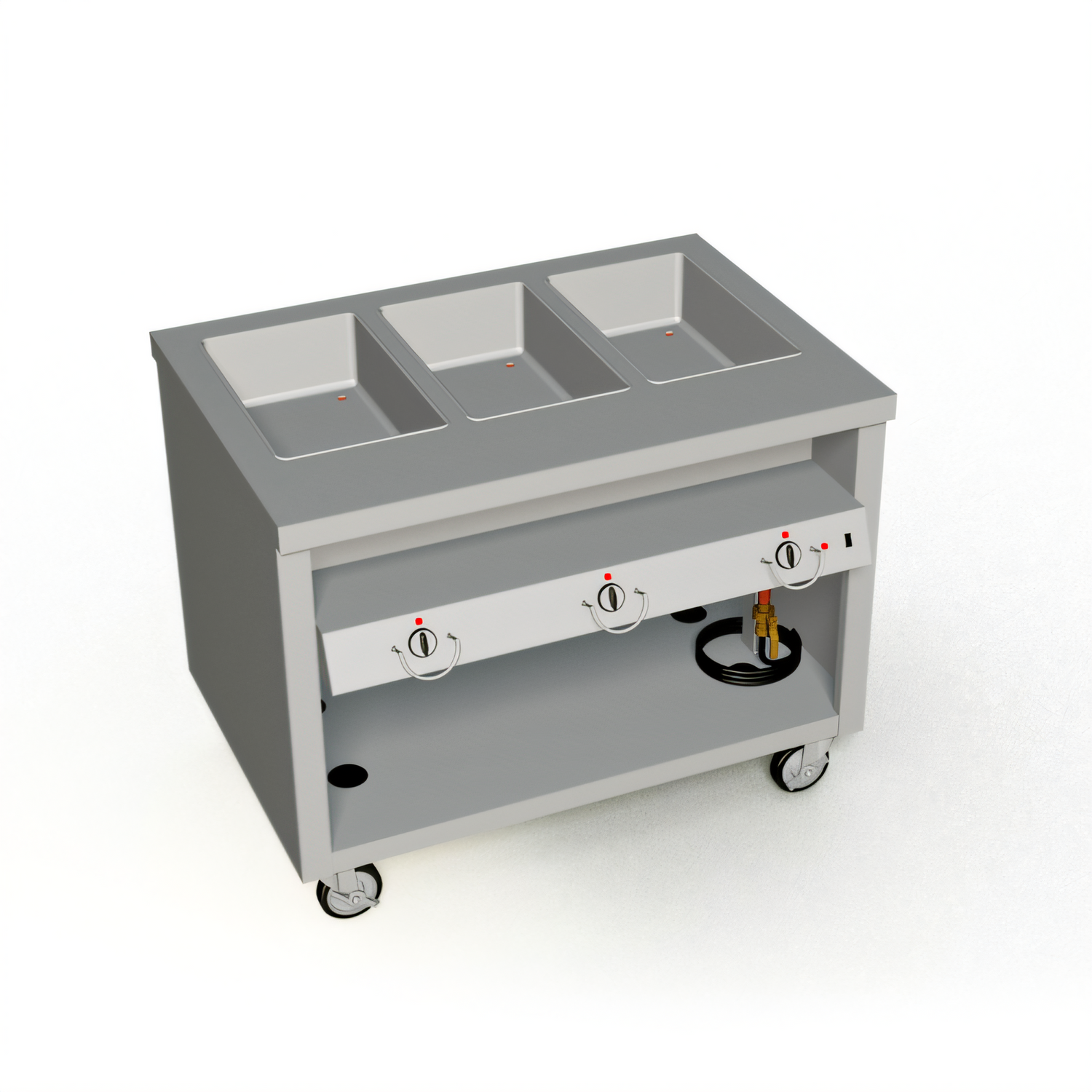 Thurmaduke Hot Food Unit, mobile, 46”W X 32”D X 36”H, 16ga stainless steel top, (3) sealed hot food wells, 1” drain line & valve, paint grip steel body & undershelf, 5” swivel casters & brakes, 6 ft cord and plug, cULus, EPH Classified