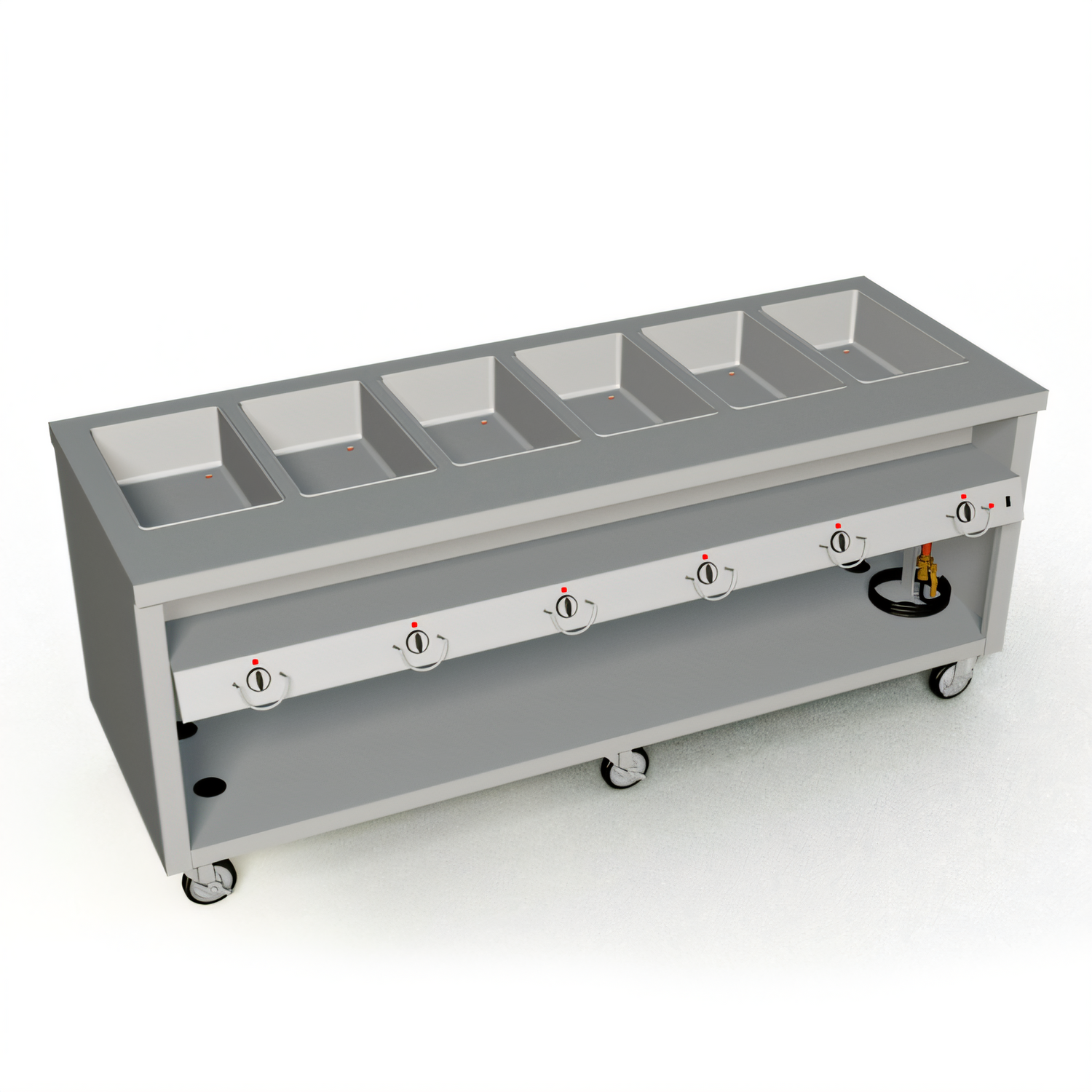 Thurmaduke Hot Food Unit, mobile, 88”W X 32”D X 36”H, 16ga stainless steel top, (5) sealed hot food wells, 1” drain line & valve, paint grip steel body & undershelf, 5” swivel casters & brakes, 6 ft cord and plug, cULus, EPH Classified