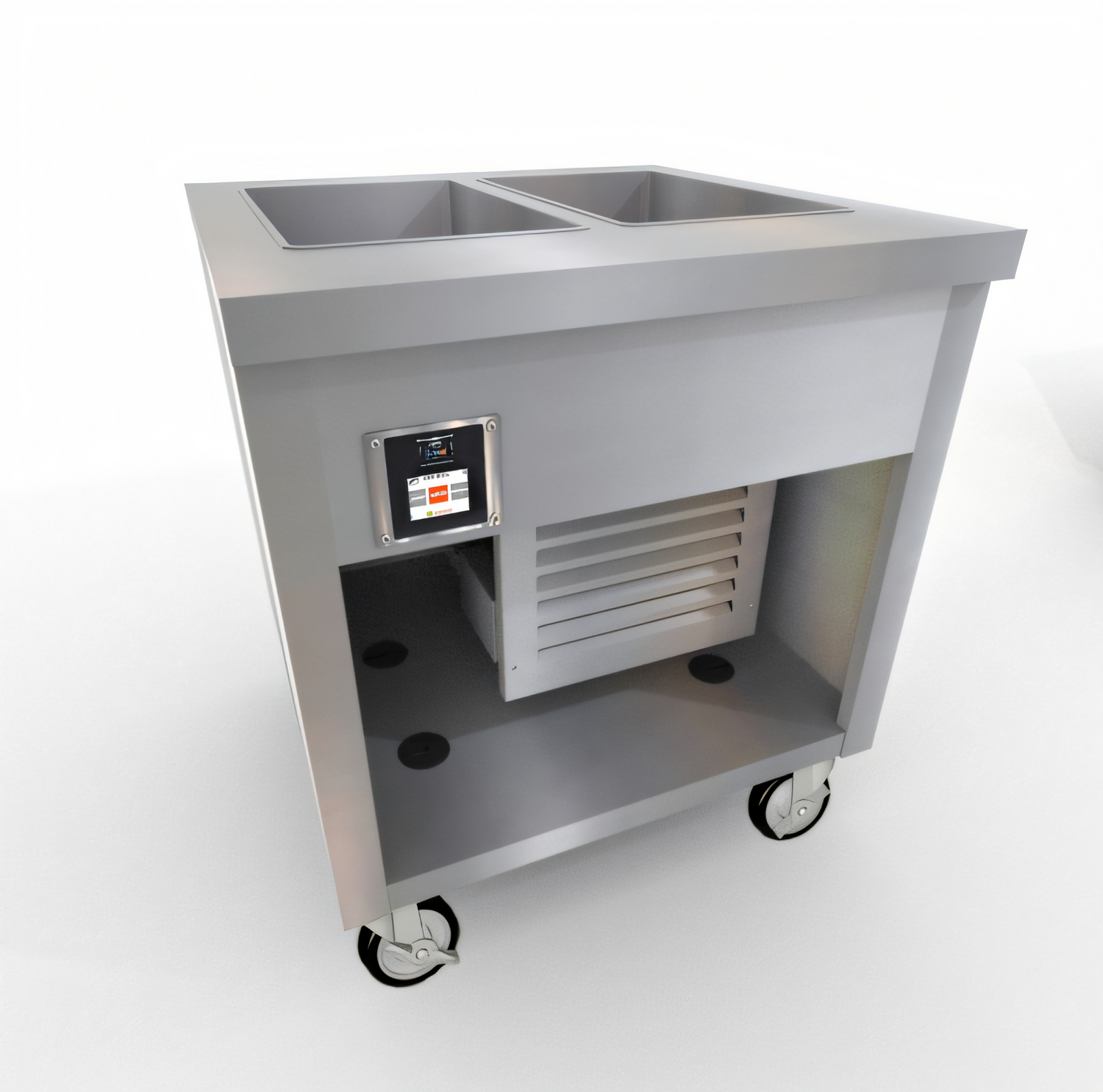 Thurmaduke™ Flush Mount Cold Pan Unit, mobile, 32"W x 32"D x 36"H, 16ga stainless steel top, (2) pan size, digital control, self-contained refrigeration, drain for each well manifolded to one location, paint grip steel body & undershelf, 5" dia. swivel casters with brakes, 6' cord & plug, 120v/60/1-ph, R448a, NEMA 5-15P, 3.7 amps, CULus, UL EPH Classified
