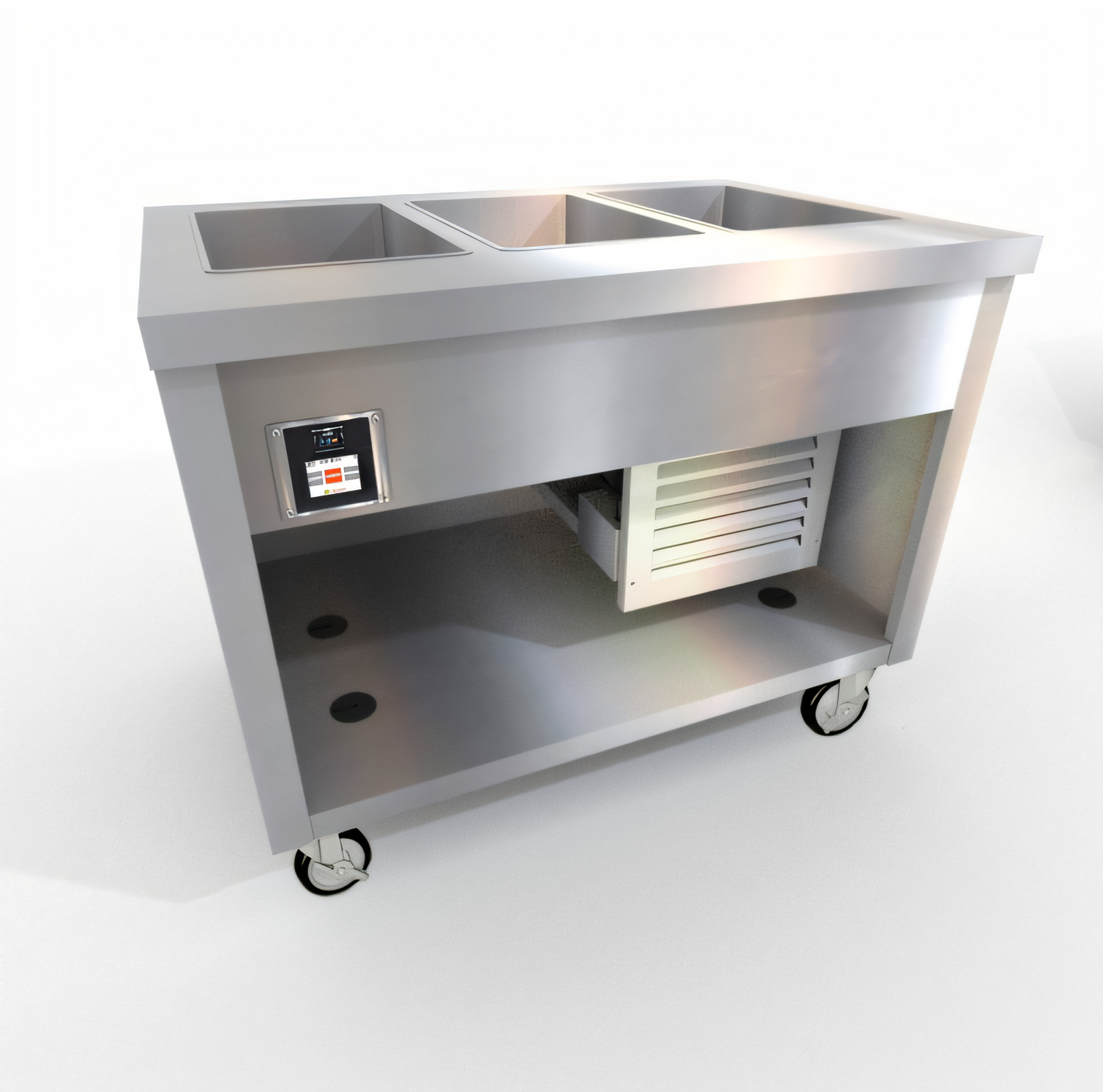 Thurmaduke™ Flush Mount Cold Pan Unit, mobile, 46"W x 32"D x 36"H, 16ga stainless steel top, (3) pan size, digital control, self-contained refrigeration, drain for each well manifolded to one location, paint grip steel body & undershelf, 5" dia. swivel casters with brakes, 6' cord & plug, 120v/60/1-ph, R448a, NEMA 5-15P, 4.9 amps, CULus, UL EPH Classified