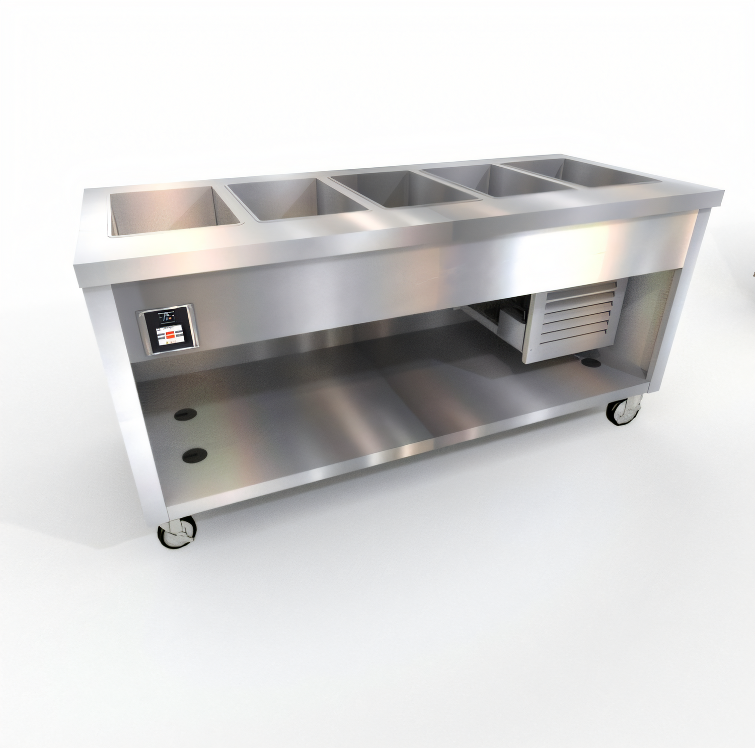 Thurmaduke™ Flush Mount Cold Pan Unit, mobile, 74"W x 32"D x 36"H, 16ga stainless steel top, (5) pan size, digital control, self-contained refrigeration, drain for each well manifolded to one location, stainless steel body & undershelf, 5" dia. swivel casters with brakes, 6' cord & plug, 120v/60/1-ph, R448a, NEMA 5-15P, 4.9 amps, CULus, UL EPH Classified