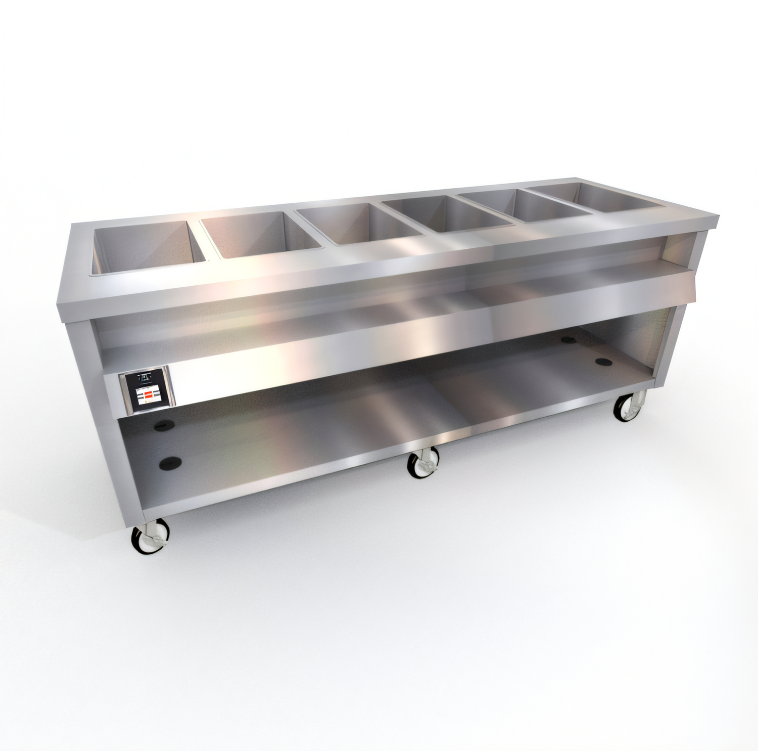Thurmaduke™ Ganged Waterless Well, mobile, electric, 88"W x 32"D x 36"H, 16ga stainless steel top, (6) stainless steel heat wells, touch screen controls, paint grip steel body & undershelf, dish shelf, 5" dia. swivel casters with brakes, 6' cord & plug, cULus, UL EPH Classified