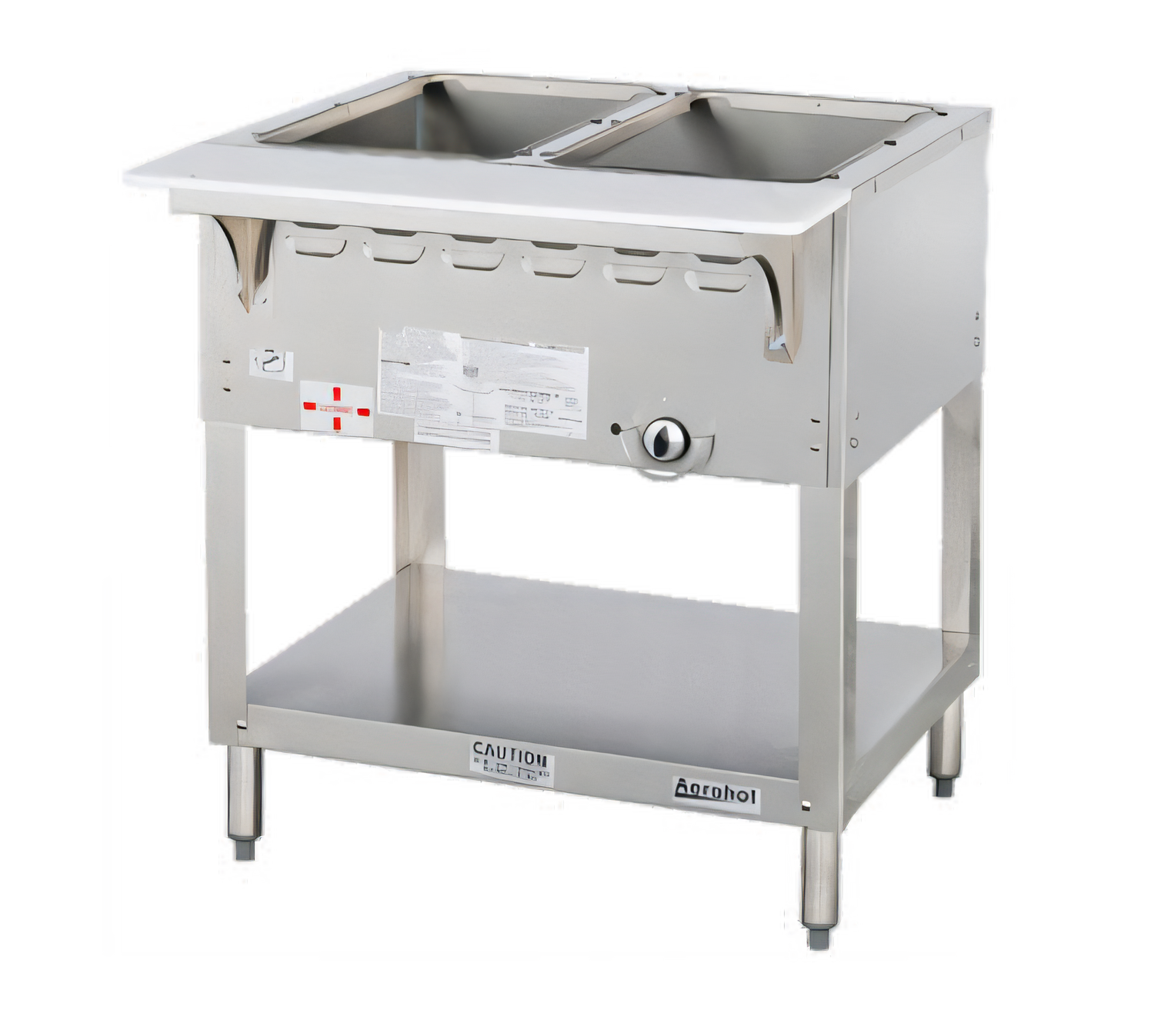 Aerohot Steamtable Wet Bath Unit, 30-3/8"W, gas, (2) pan size open water bath with (1) 15,000 BTU burner with adjustable gas valve control & safety pilot, stainless steel top with 1/2" thick x 7" wide poly carving board, 1" drain & valve, stainless steel open base with undershelf, legs & feet, CSA STAR, UL EPH Classified