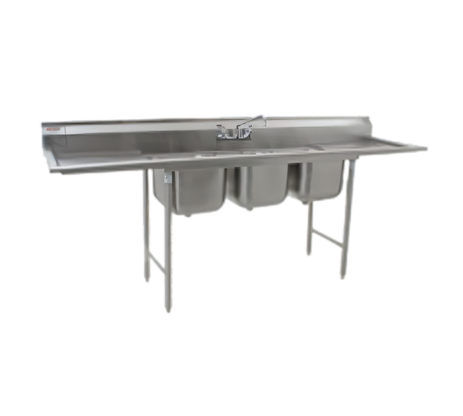 414 Series Sink, three compartment, 114"W x 31-3/4"D, 430 stainless steel top with 304 stainless steel sink bowls, coved corners, 24" x 24" x 13-1/2" deep compartments, 18" drainboards on left & right, 9-1/2"H backsplash with 1" upturn & tile edge, 8" OC splash mount faucet holes, 2" euro-style edge on front & sides, includes (3) 3-1/2" basket drains, galvanized legs & side crossbracing, adjustable plastic bullet feet, NSF (FLYER)