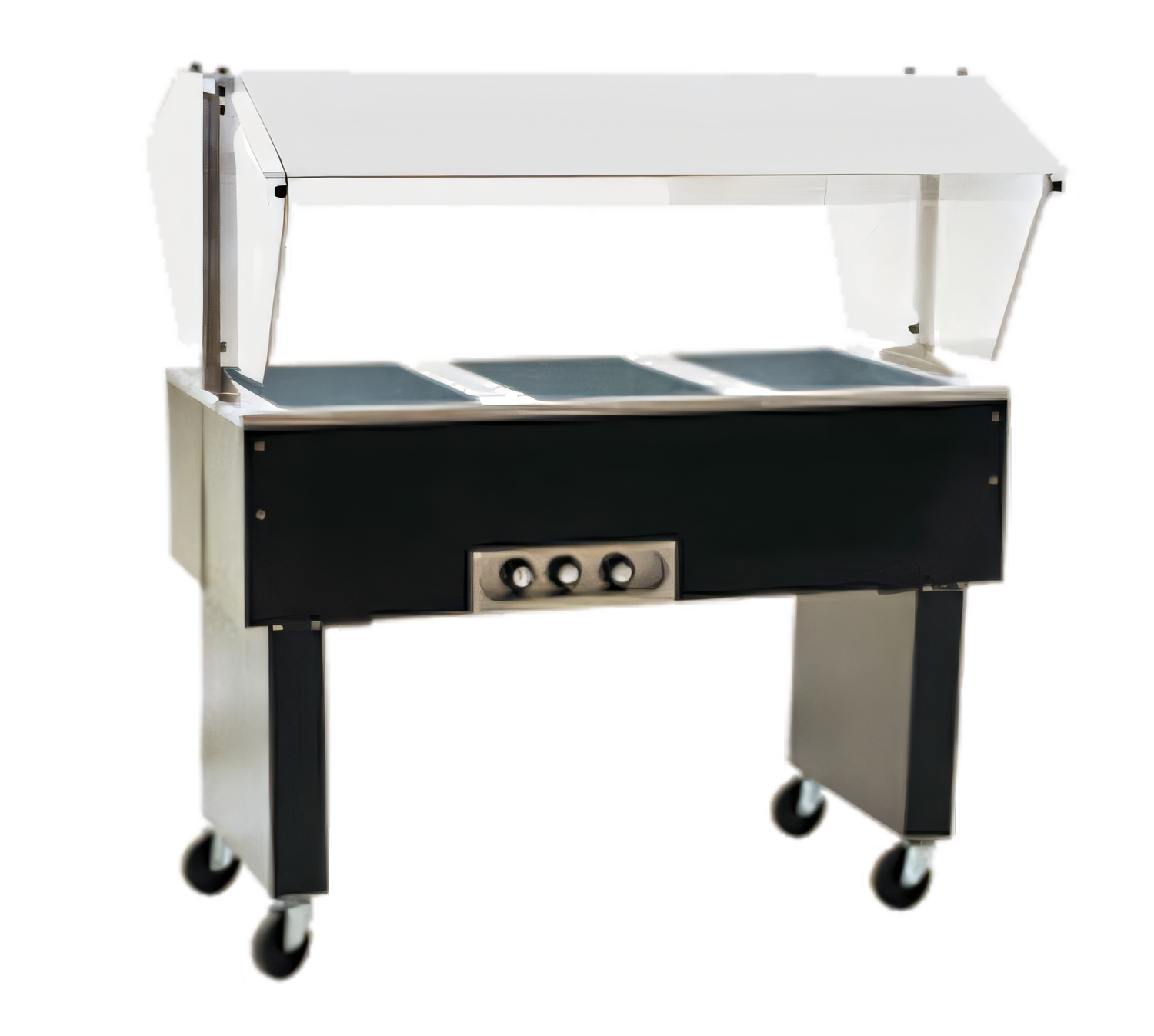 Deluxe Service Mate, Portable Buffet Hot Food Table, electric, 48"W, (3) 12" x 20"Hot food wells, stainless steel top, steel wrapper/laminated woodgrain vinyl finish, clear double sided Tuffak® sneeze guard, open base, 4" casters, 208v/60/3-ph, 2250w, 6.9 amps, NEMA 15-20P, NSF, cULus (for dry application only)