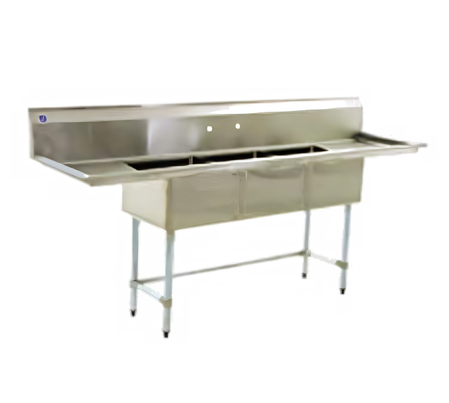 (IMPORTED) BlendPort® BPFC Series Sink, 28" x 20", three compartment, 16/304 stainless steel construction, (2) 30" drainboards, 19"H stainless steel legs, gussets, stainless steel bullet feet, 14" deep sink bowl with bowl straps between bowls, 3 1/2" basket drain, crossbracing runs front-to-back & side-to-side & faucet holes on 8" centers (2 sets), leak tested & crated with hardwood for shipping, NSF (Flyer NET Pricing)