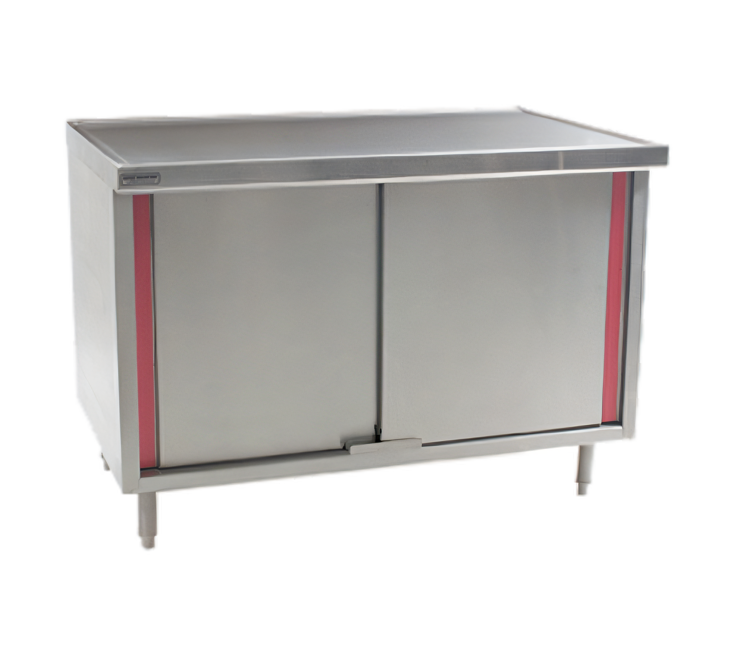 Spec-Master® Marine Series Work Table, cabinet base with sliding doors, 120"W x 30"D, 14/304 stainless steel top, marine edge on all sides, (4) sliding doors, Uni-Lok® gusset system, stainless steel cabinet body, legs, & adjustable bullet feet, NSF