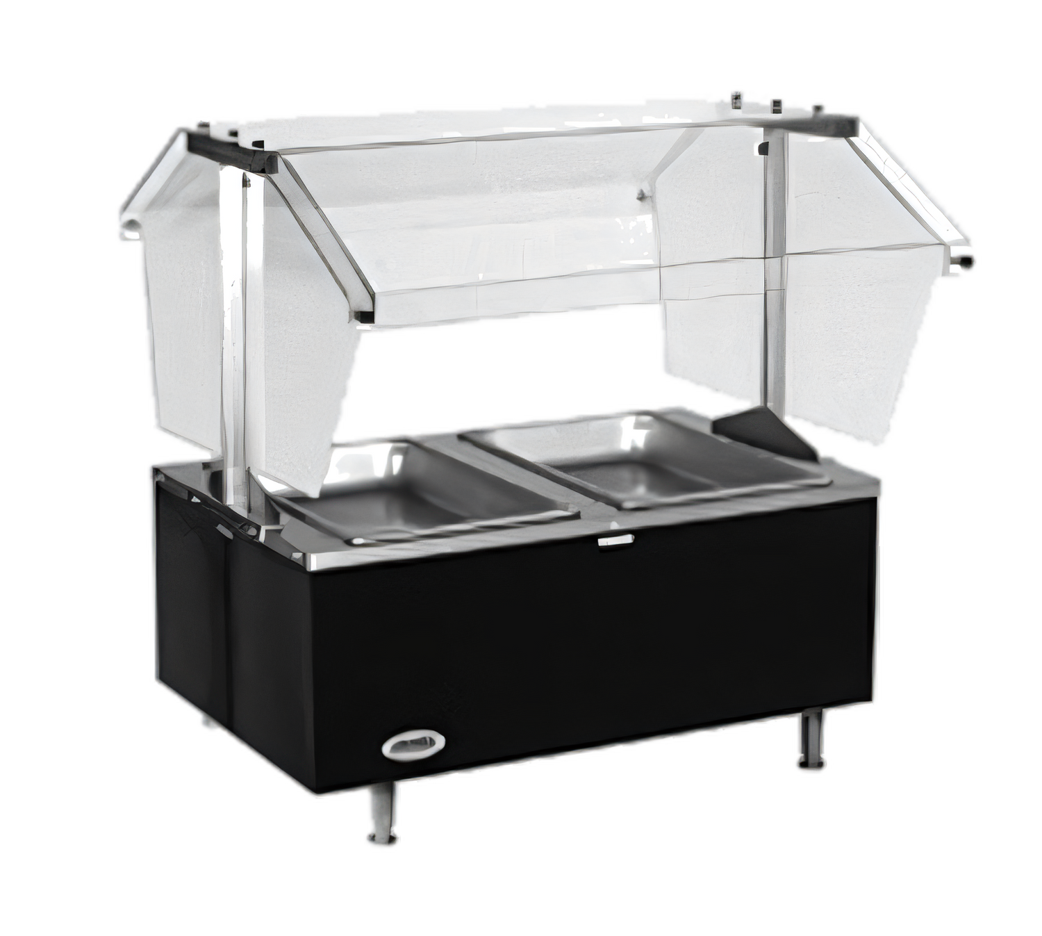 Deluxe Service Mate, Counter Top Buffet Hot Food Unit, electric, 63-1/2" L, (4) 12" x 20"Hot food wells, stainless steel top, steel wrapper/laminated black vinyl finish, clear double sided Tuffak® sneeze guard, adjustable feet, 208/60/3-ph, 3000w, 10.5 amps, NEMA 15-20P, NSF, cULus