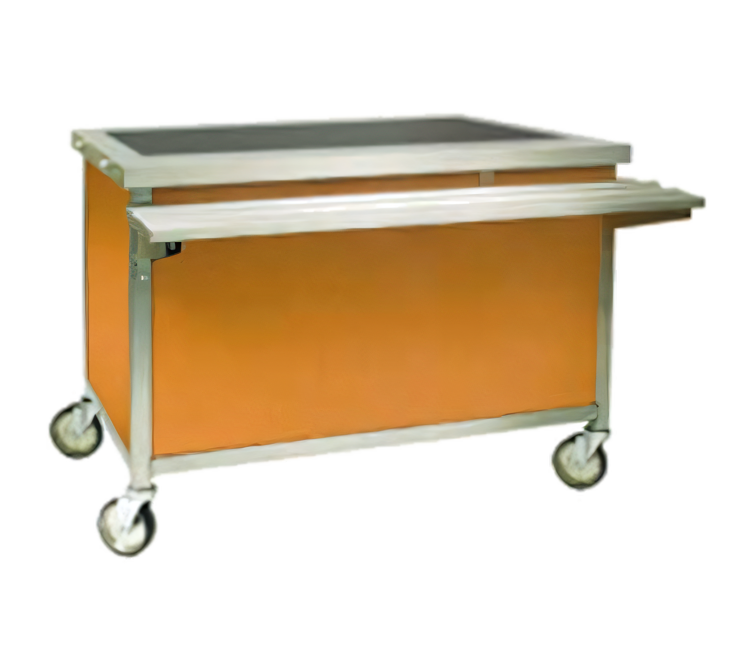 Director's Choice® Heated Surface Unit, 78"W x 30"D x 34"H, recessed stainless steel top (66" x 19-1/2"Heated surface area) with thermostatic controls, 16/304 stainless steel top, welded 1-1/2" square tubular open base with apron on operator side, laminated front panel holly berry red (Wilsonart D307-60) on 18 gauge galvanized subpanel, 5" poly tread casters (2 with brake), 120v/60/1-ph, 11.1 amps, 1330w, NEMA 5-20P, cord & plug, UL, NSF