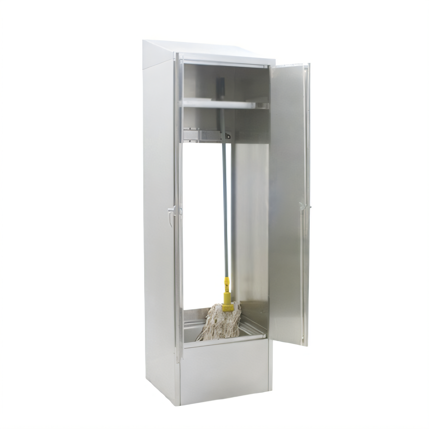 Mop Sink Cabinet, single width, 25"W x 22-1/4"D x 84-1/4"H, slanted top, holds (2) mops, (2) hinged doors with transverse rod handles & keyed locks, 8" deep mop sink with service faucet, (1) 12"D fixed overhead shelf, includes 30" spray hose & spray hose bracket, 430 stainless steel construction, NSF (FLYER)