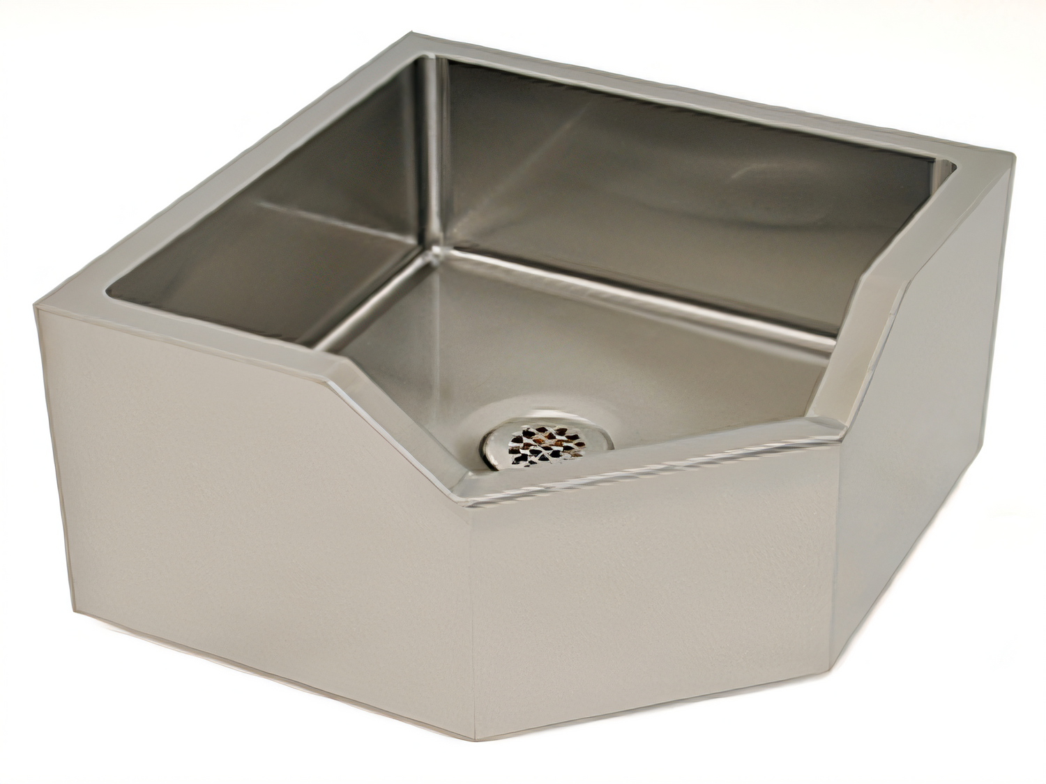 Eagle Corner Mop Sink with Drop Edge, with 24" W x 24" L x 8˝- deep fabricated bowl, full skirt, 2" NPS drain with stainless steel removable strainer plate, 304 stainless steel construction, Made in USA