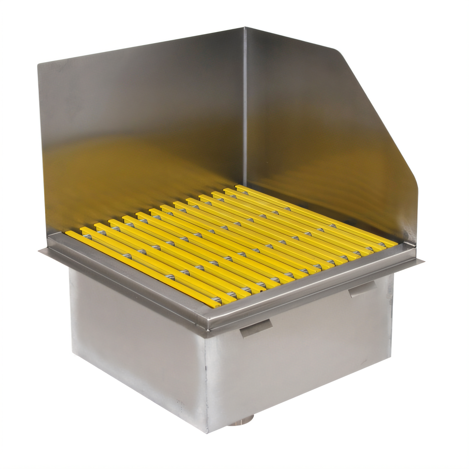Mop sink, flush floor mounted, 23.625"W x 23.625"D x 32.75"H, heavy gauge type 304 stainless steel all-welded construction. 19"W x 21"L x 10"D bowl, 16 1/2" high standard backsplash with end splash on right, anti-splash angles at front and rear, built-in pitch towards drain, stainless steel drain with removable perforated stainless steel basket, fiberglass grating features 1˝-high yellow polyester material with non-slip grit top surface and tapered “I” beam construction, NSF, Made in USA
