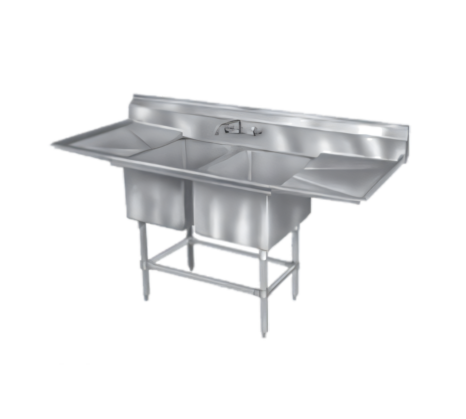 Spec-Master® FN Series Sink, two compartment, 71-1/2"W x 27"D, 14/304 stainless steel top, coved corners, 18" wide x 20" front-to-back x 14" deep compartments, 30" drainboard on right, 9-1/2"H backsplash with 1" upturn & tile edge, 8" OC splash mount faucet holes, rolled edges on front & sides, includes 3-1/2" basket drains, stainless steel crossbracing on all sides, stainless steel legs & adjustable bullet feet, NSF