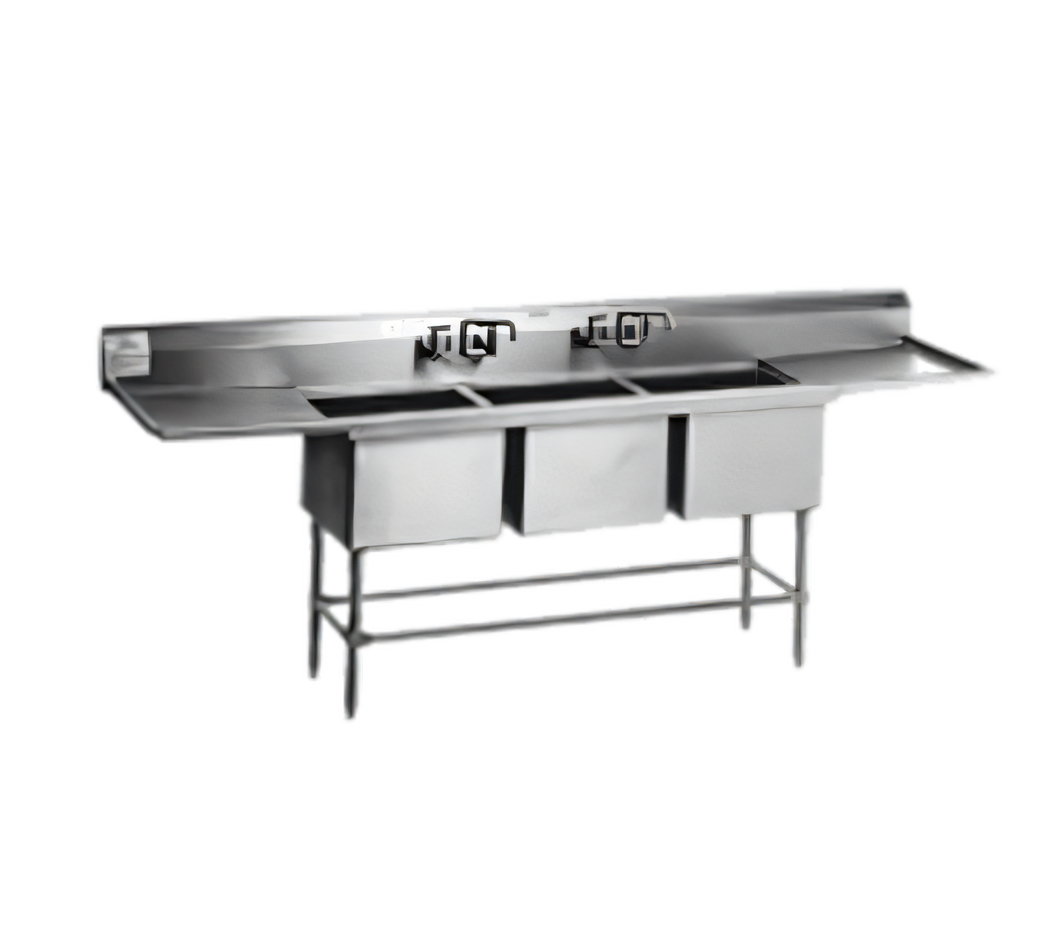 Spec-Master® FN Series Sink, three compartment, 126"W x 35"D, 14/304 stainless steel top, coved corners, 20" wide x 28" front-to-back x 14" deep compartments, 30" drainboards on left & right, 9-1/2"H backsplash with 1" upturn & tile edge, (2) sets of 8" OC splash mount faucet holes, rolled edges on front & sides, includes 3-1/2" basket drains, stainless steel crossbracing on all sides, stainless steel legs & adjustable bullet feet, NSF