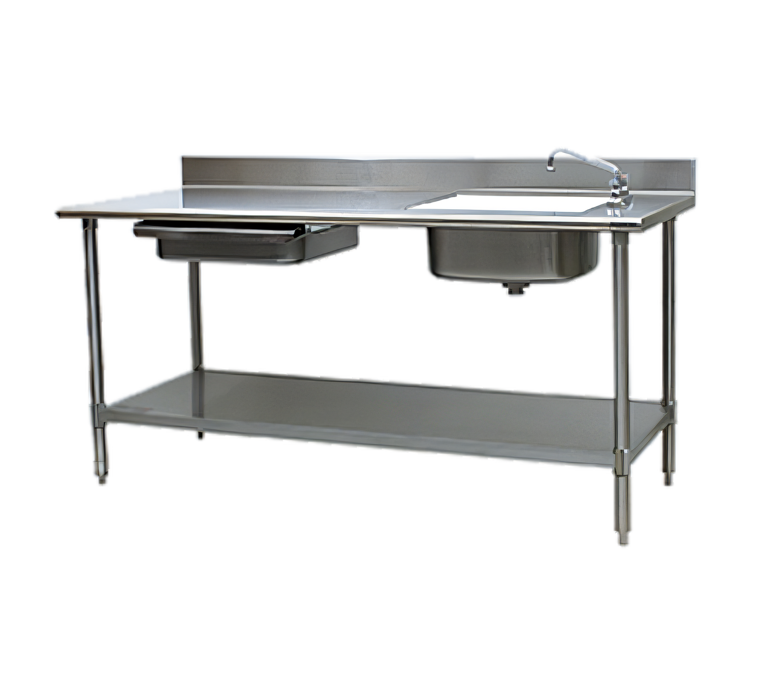 Spec-Master® Series Work Table With Prep Sink, 72"W x 30"D, 4-1/2"H backsplash, 14/304 stainless steel top, rolled front edge, 20'W x 16"D front-to-back x 8" deep sink bowl on right with deck mount gooseneck faucet, 20" x 20" x 5" stainless steel drawer mounted on left, includes 1/2" thick polymer cutting board/sink cover, adjustable stainless steel undershelf, Uni-Lok® gusset system, stainless steel legs & adjustable bullet feet, NSF
