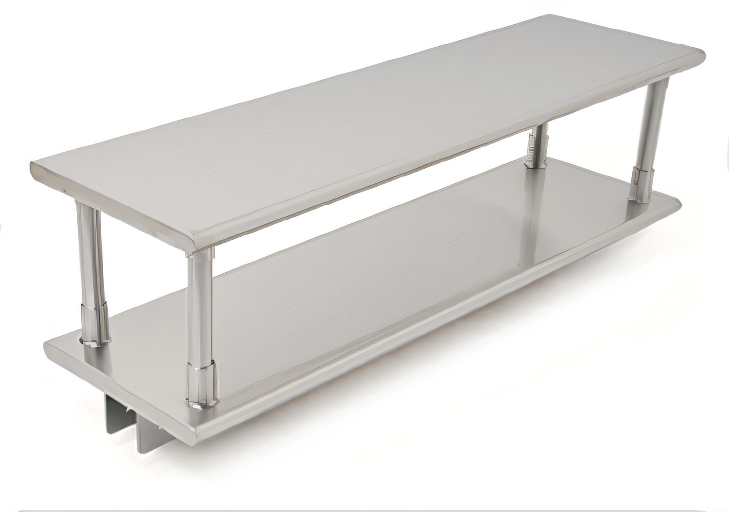 Eagle Pass-Thru Shelf with Overshelf, 24"W x 18"D, shelf and overshelf feature rolled edge on front and back, with ends turned down 90˚, support channel & wall brackets included for mounting, (4) 1-5⁄8˝ (41mm) diameter 16 gauge stainless steel posts, 16/304 stainless steel construction, Shipped knocked down