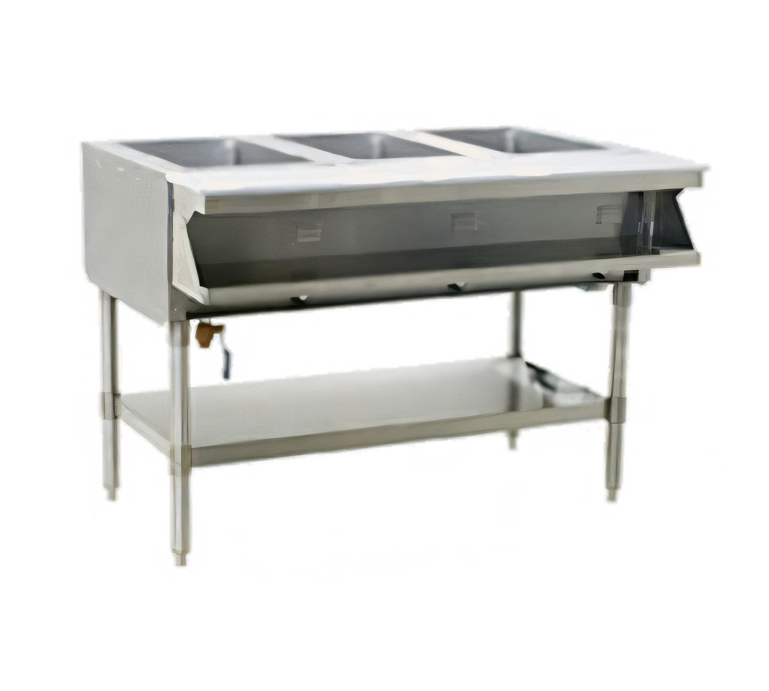 Sealed Well Hot Food Table, electric, open base, 33"W x 32-1/4"D x 35-1/2"H, wet or dry operation, (2) 12" x 20" stainless steel sealed wells, individual infinite controls, (2) 3/4" drains, drain manifold with valve, includes removable 8"D polyethylene cutting board, stainless steel dish shelf, & adjustable stainless steel undershelf, 20/430 highly polished stainless steel top & body, 1-5/8" diameter stainless steel tubular legs, adjustable stainless steel bullet feet, 1428 watts, 208v/60/3-ph, 6.0 amps, NEMA 15-20P, NSF, cULus