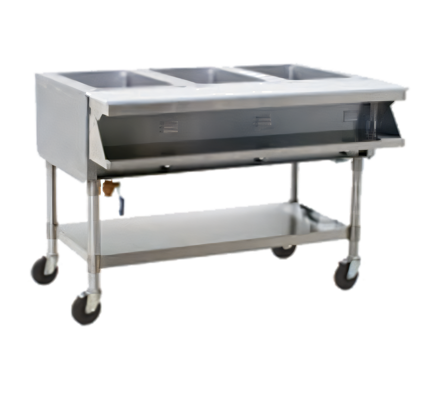 Portable Sealed Well Hot Food Table, electric, open base, 50-1/2"W x 32-1/4"D x 34"H, wet or dry operation, (3) 12" x 20" stainless steel sealed wells, individual infinite controls, (3) 3/4" drains, drain manifold with valve, includes removable 8"D polyethylene cutting board, stainless steel dish shelf, & adjustable stainless steel undershelf, push bar attached to end panel, 20/430 highly polished stainless steel top & body, 1-5/8" diameter stainless steel tubular legs, 4" diameter swivel casters, 2142 watts, 208v/60/3-ph, 6.0 amps, NEMA 15-20P, NSF, cULus