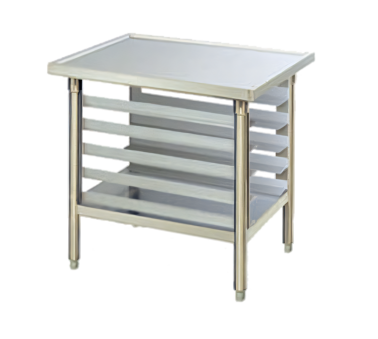 Equipment Stand, stationary, 27-1/8"W x 31-1/8"D x 34"H, 600 lbs maximum capacity, 14/304 stainless steel top, box marine edge on all sides, removable pan rack holds (5) 18" x 26" pans, fixed stainless steel undershelf, Uni-Lok® gusset system, fully welded construction, stainless steel legs with adjustable bullet feet