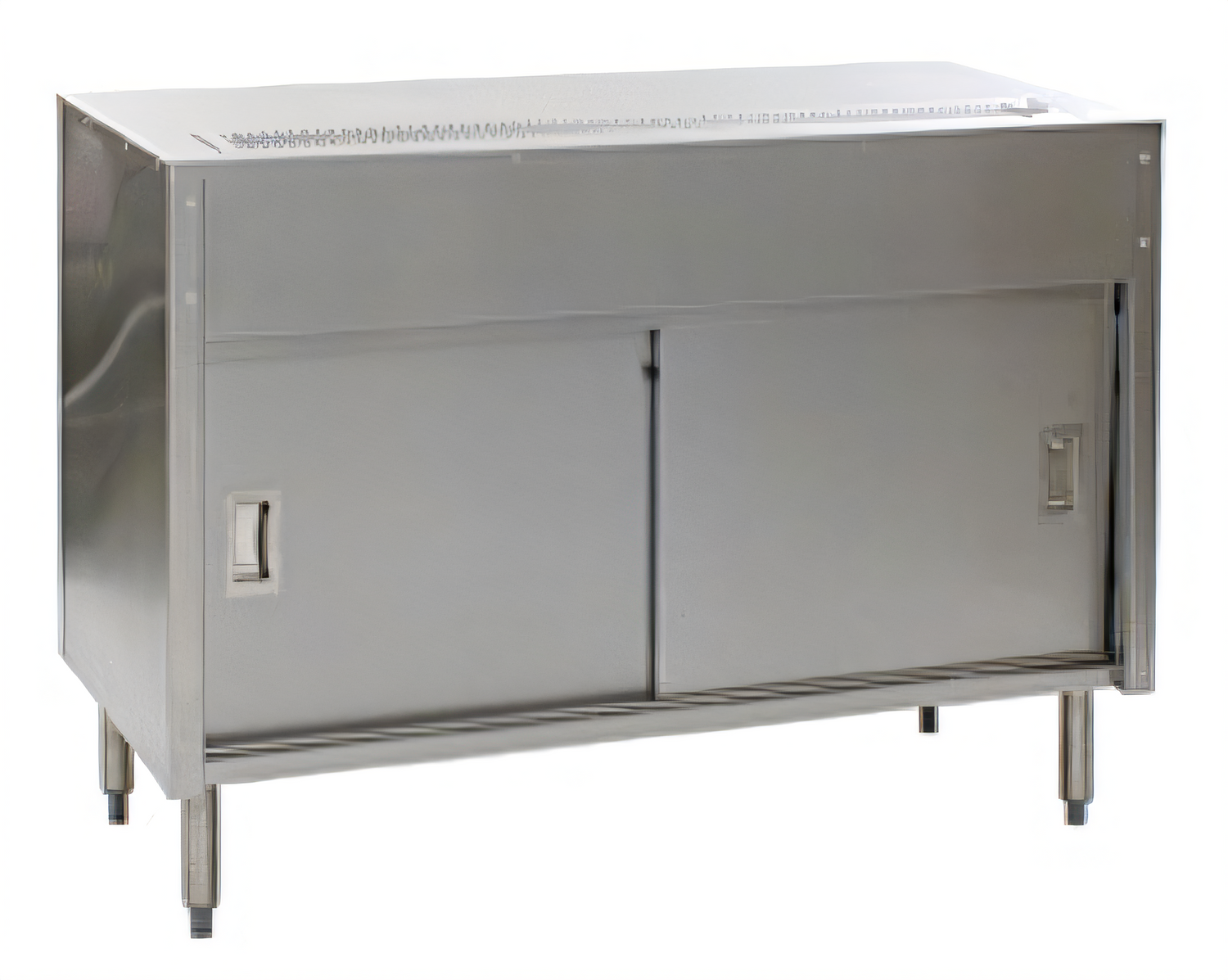 Spec-Master® Urn Stand, 48"W, 16 gauge stainless steel top, 4-3/4" trough sloped to 1" drain, full length removable louvered grate, 20/430 stainless steel enclosed base with sliding doors, 1-5/8" O.D. stainless steel tubular legs with adjustable plastic bullet feet, NSF
