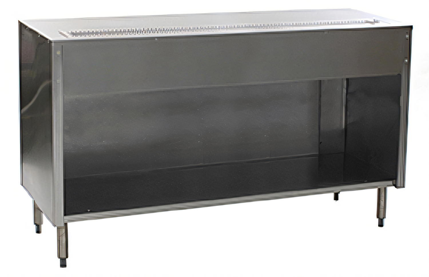 Spec-Master® Urn Stand, 63-1/2"W, 16 gauge stainless steel top, 4-3/4" trough sloped to 1" drain, full length removable louvered grate, 20/430 stainless steel enclosed base with open shelf, 1-5/8" O.D. stainless steel tubular legs with adjustable plastic bullet feet, NSF