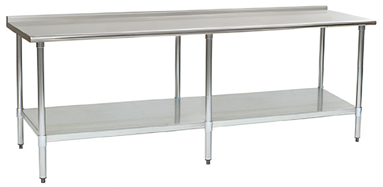 Deluxe Series Work Table, 96"W x 36"D, 16/300 series stainless steel top with 1-1/2"H rear up-turn, rolled front edge, adjustable galvanized undershelf, Uni-Lok® gusset system, (6) galvanized legs with adjustable plastic bullet feet, NSF