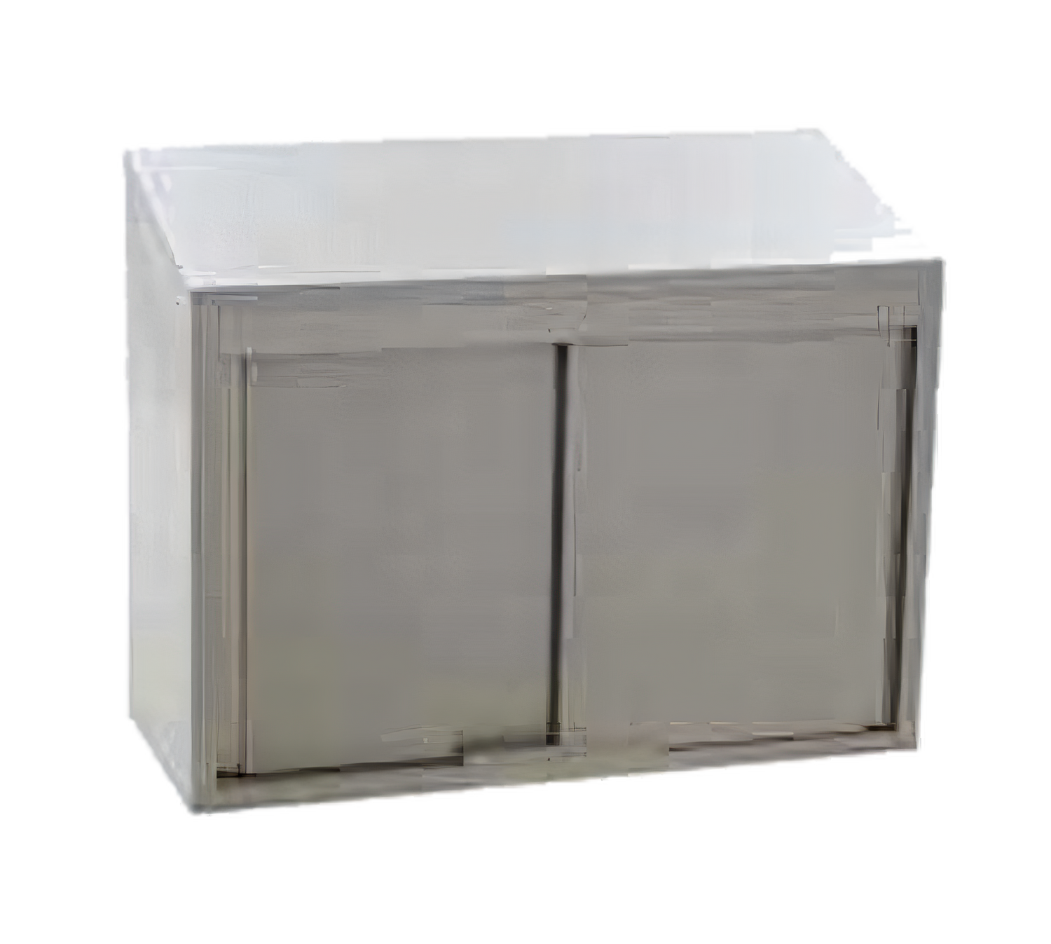 Cabinet, wall mount, 96"W x 15"D x 28"H, enclosed front, sloped top, (4) removable double-panel sliding doors, fixed intermediate shelf with safety edges, back recessed with concealed mounting plate, 18/304 stainless steel construction, NSF